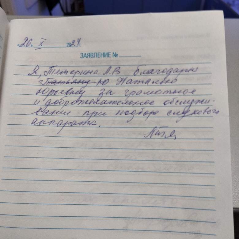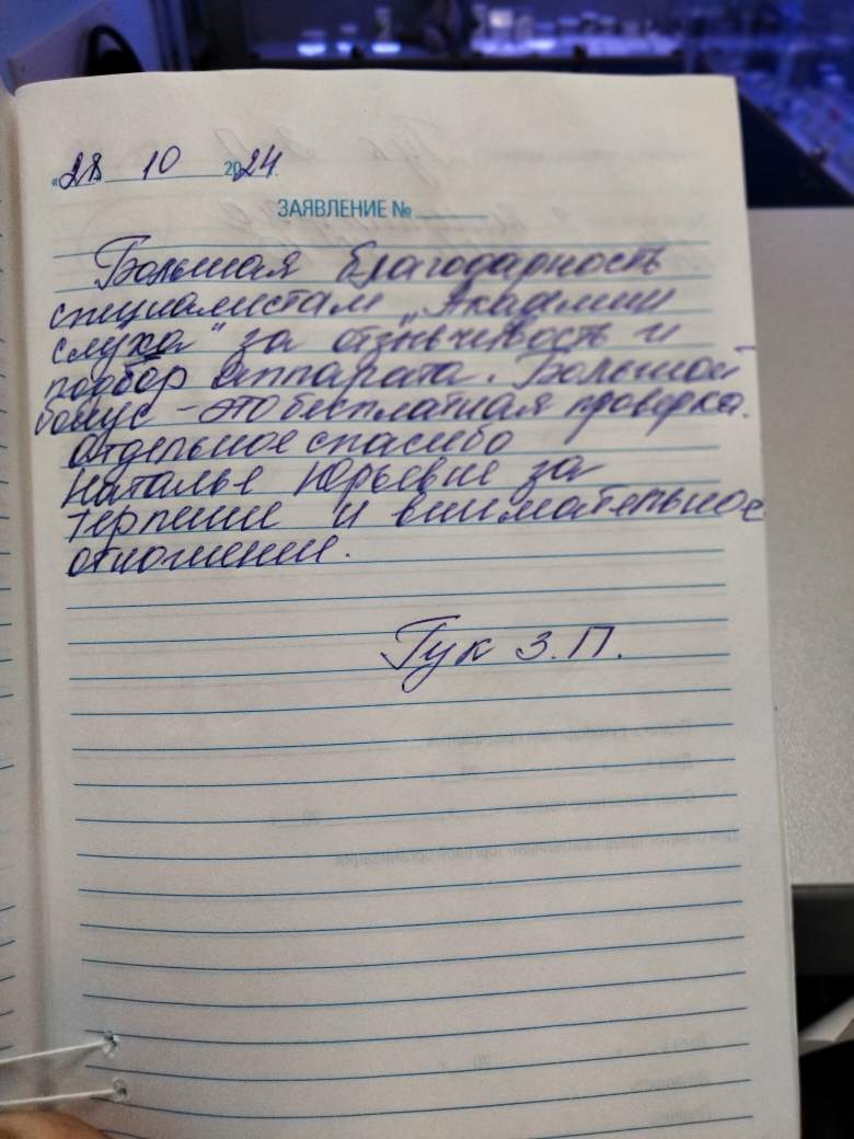 Большая благодарность специалистам "Академии слуха" за отзывчивость и подбор аппарата. Большой бонус - это бесплатная проверка. Отдельное спасибо Наталье Юрьевне за терпение и внимательное отношение.