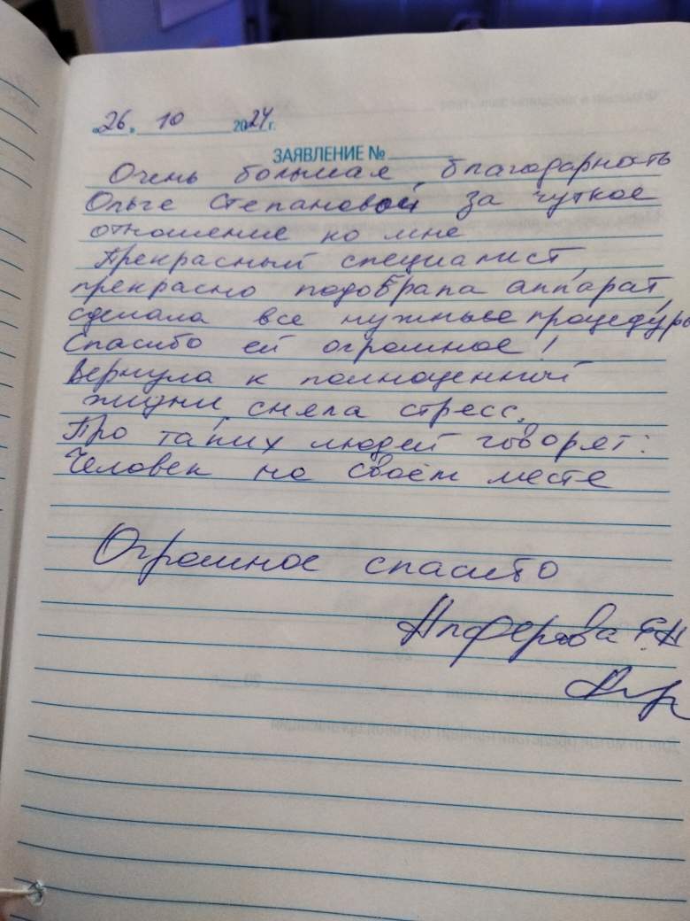 Очень большая благодарность Ольге Степановой за чуткое отношение ко мне. Прекрасный специалист, прекрасно подобрала аппарат, сделала все нужные процедуры. Спасибо ей огромное! Вернула к полноценной жизни, сняла стресс. Про таких людей говорят: человек на своём месте. Огромное спасибо.