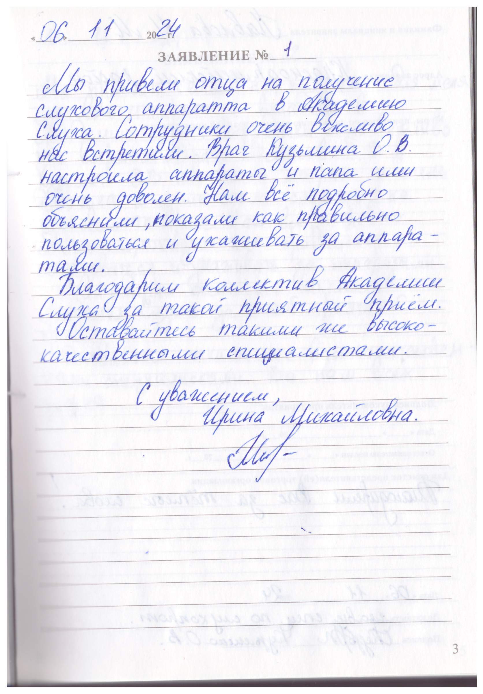 Мы провели с семьей на получение для меня слухового аппарата и вкладыш в академию слуха. Сотрудники очень вежливо нас встретили. Врачи Арсентьева Т.В. и Кузьмина О.В. настроила аппараты и очень довольна и лучше стала слышать на слуховом аппарате. Нам все подробно объяснили, показали как правильно пользоваться и ухаживать за аппаратами.