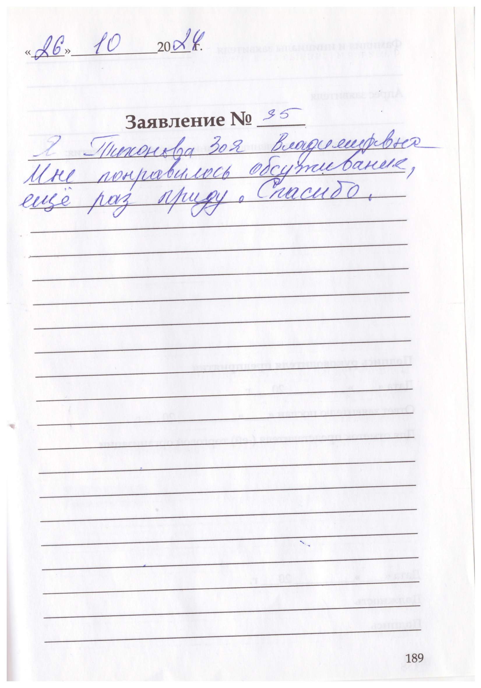 Я Тихонова Зоя Владимировна. Мне понравилось обслуживание, еще раз приду. Спасибо.