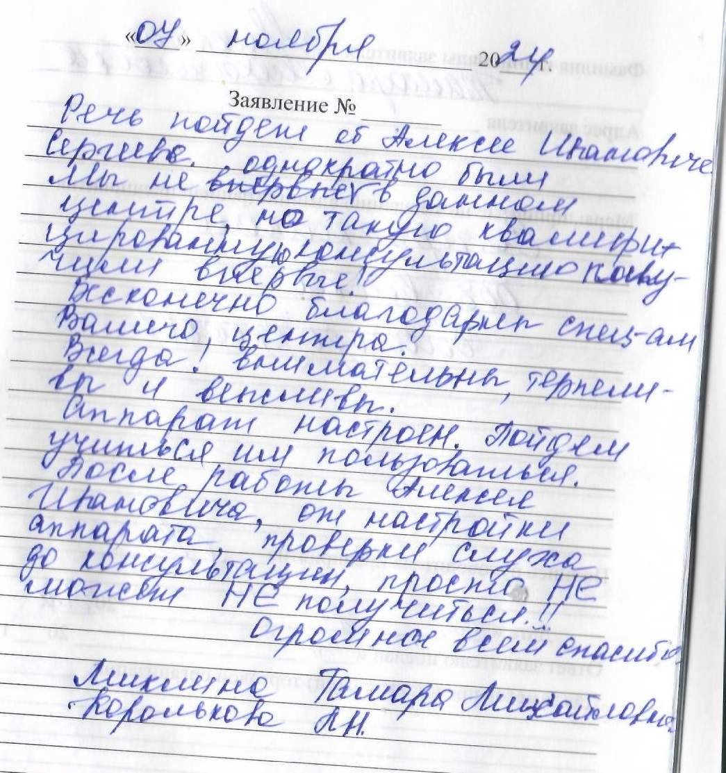 Речь пойдет об Алексее Ивановиче Сергееве. Мы неоднократно были в данном центре, но такую квалифицированную консультацию получили впервые! Бесконечно благодарны специалистам Вашего центра. Всегда! внимательны, терпеливы и вежливы. Аппарат настроен. Пойдем учиться им пользоваться. После работы Алексея Ивановича, от настройки аппарата, проверки слуха до консультации, просто НЕ может НЕ получиться. Огромное всем спасибо.