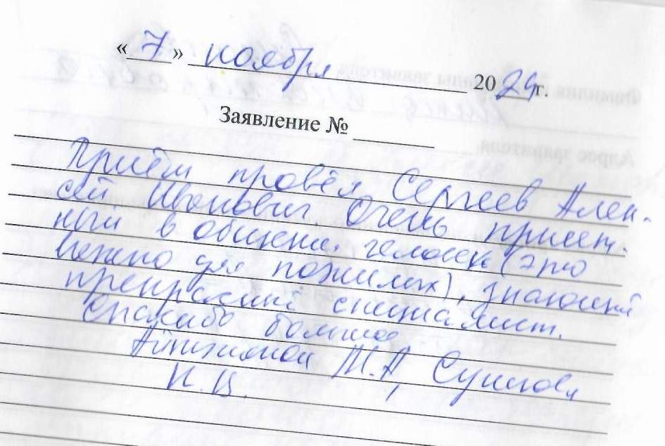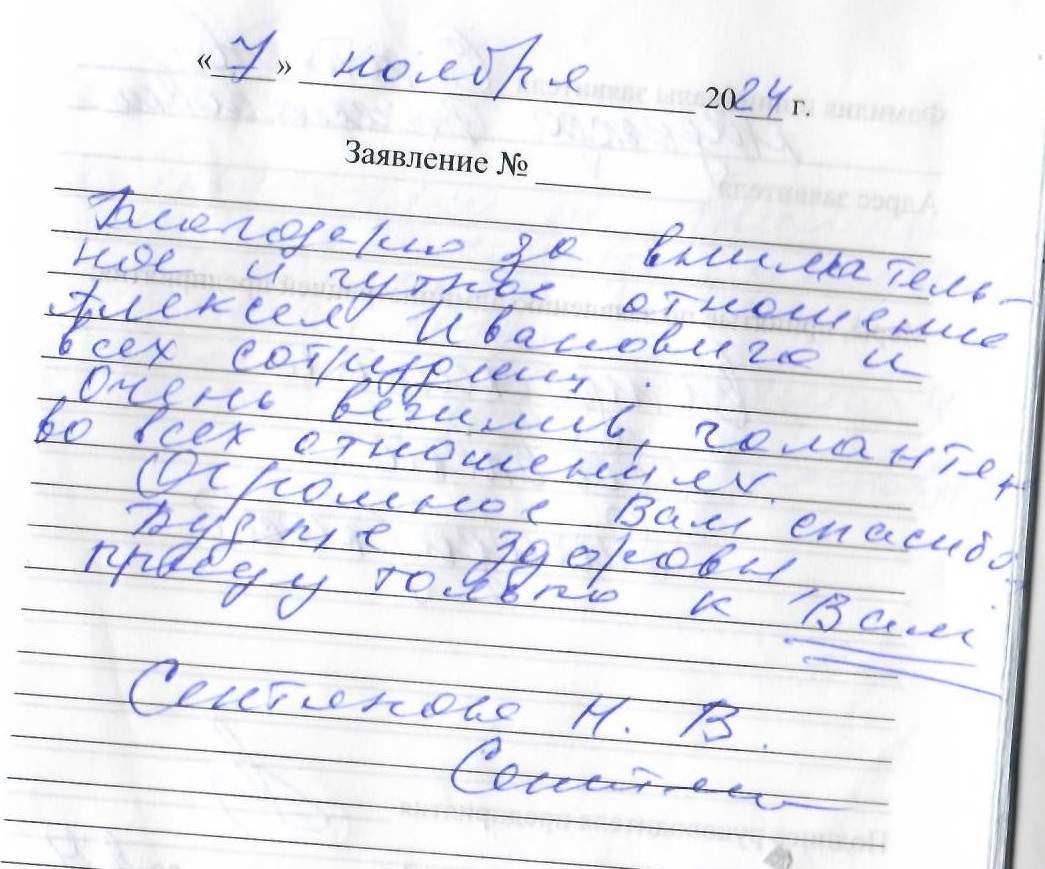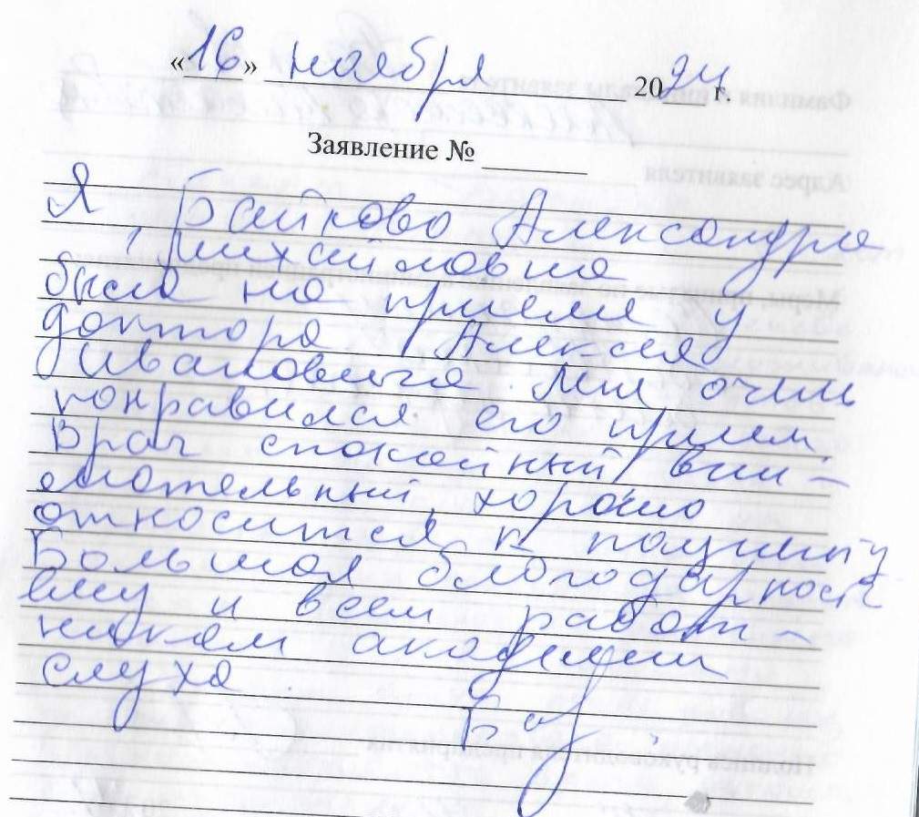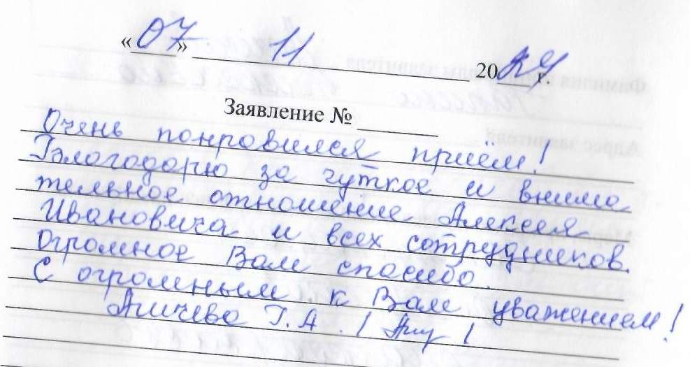 Очень понравился приём! Благодарю за чуткое и внимательное отношение Алексея Ивановича и всех сотрудников. Огромное Вам спасибо.