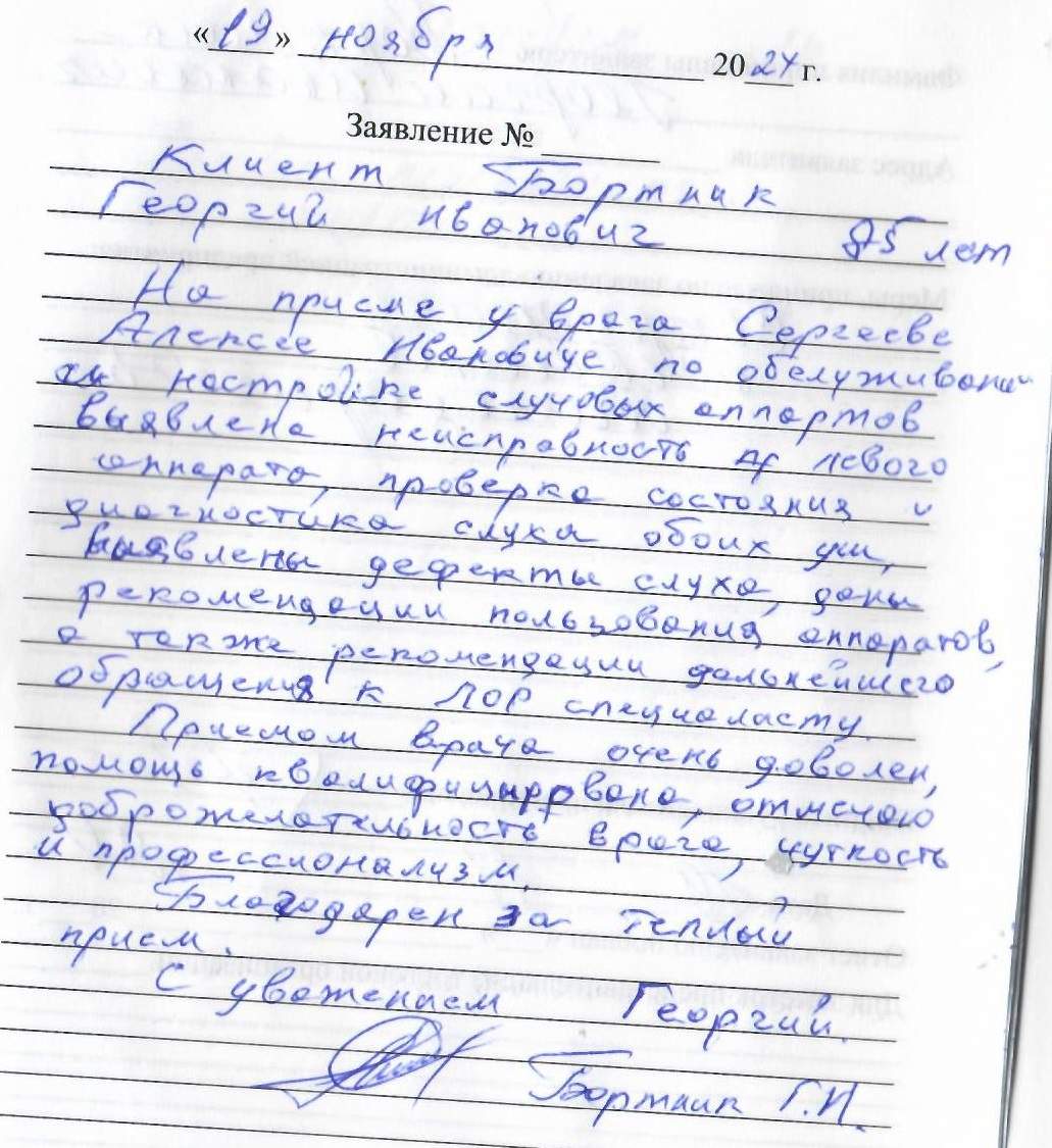 На приеме у врача Сергеева Алексея Ивановича по обслуживанию и настройке слуховых аппаратов выявлена неисправность левого аппарата, проверка состояния и диагностика обоих уш, выявлены дефекты слуха, даны рекомендации пользования, а также рекомендации дальнейшего обращения к ЛОР специалисту. Приемом врача очень доволен, помощь квалифицированная, отмечаю доброжелательность врача, чуткость и профессионализм. Благодарен за теплый прием.