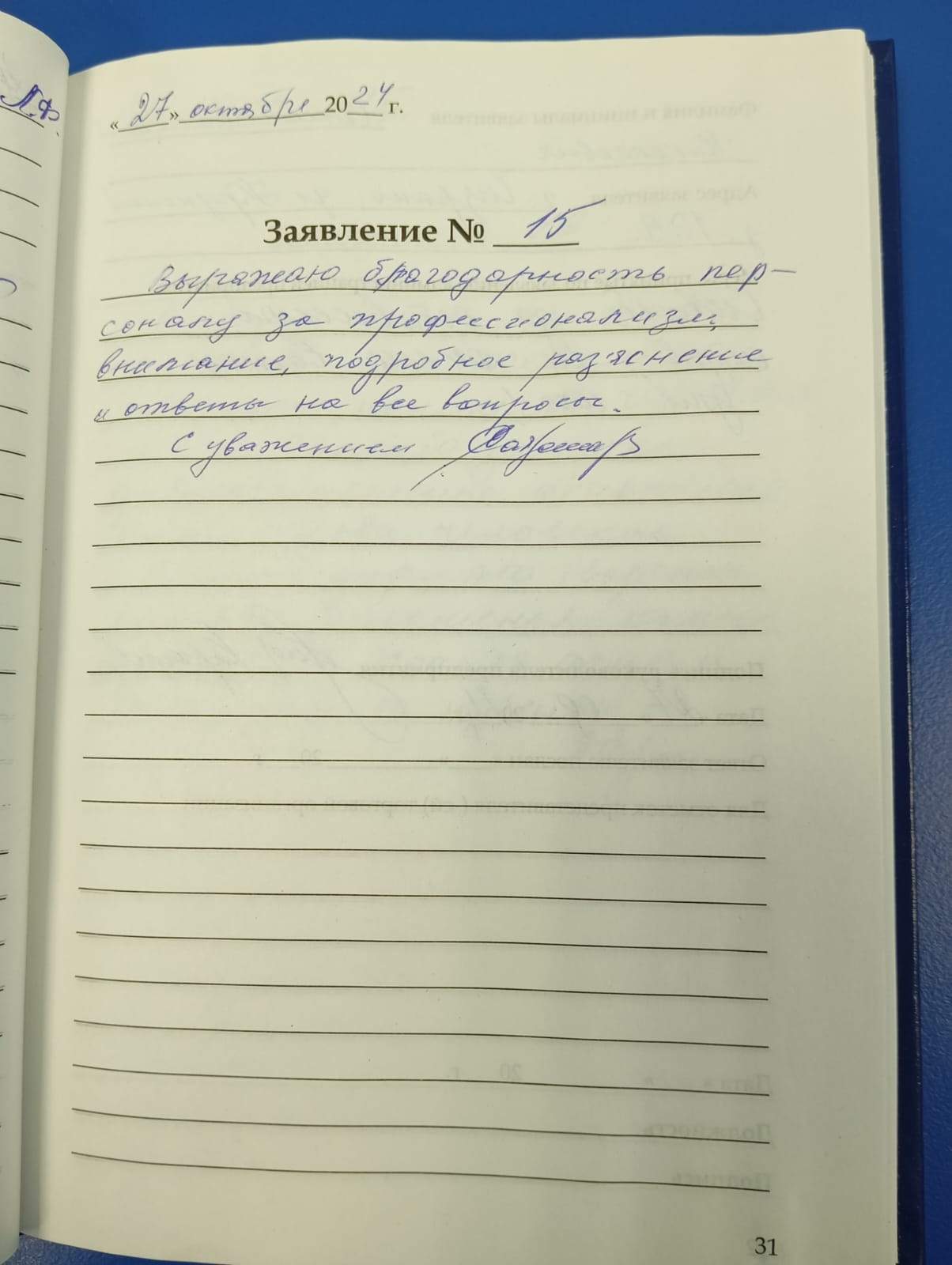 Выражаю благодарность персоналу за профессионализм,внимание,подробное разъяснение и ответы на все вопросы.