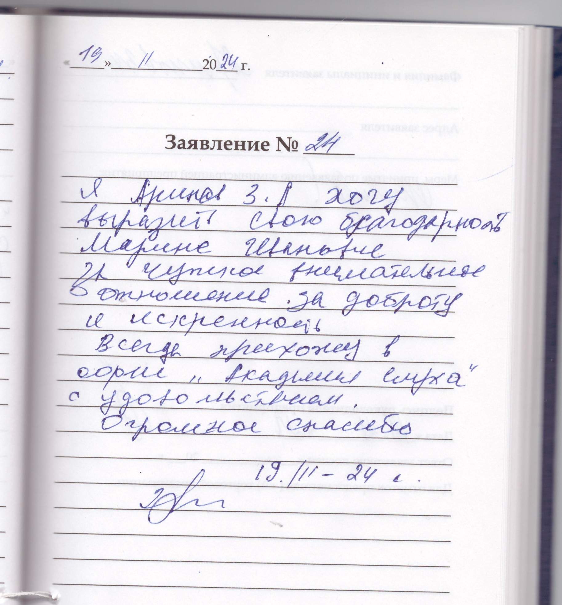 Я, Арипов ЗЛ хочу выразить свою благодарность Марине Ивановне за чуткое внимательное отношение, за доброту и искренность. Всегда прихожу в офис "Академии Слуха" с удовольствием. Огромное спасибо.