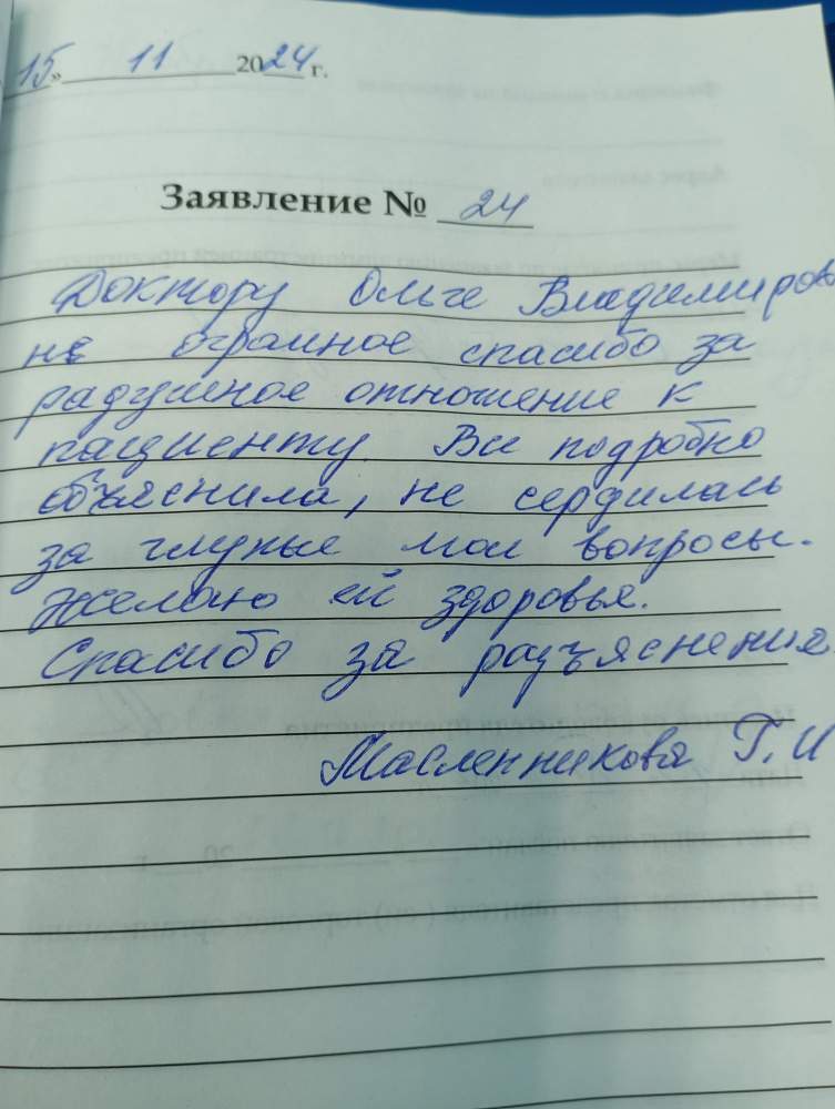 Доктору Ольге Владимировне огромное спасибо за радушное отношение к пациенту. Все подробно объяснила, не сердилась за глупые мои вопросы. Желаю ей здоровья. Спасибо за разъяснения.