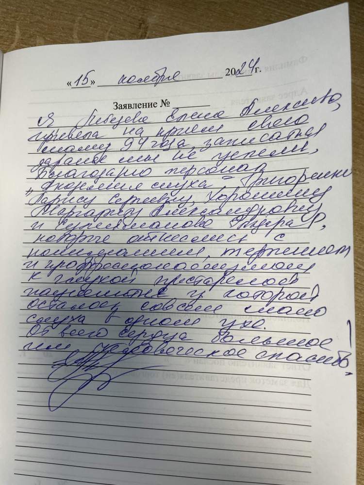 Я, Лебедева Елена Алексеевна, привела на прием свою маму 94 года. Записаться заранее мы не успели. Благодарю персонал Академии слуха- Григоренко Ларису Сергеевну, Хорюшину Маргариту Александровну и Сулейманова Эльдара Р. , которые отнеслись с пониманием, терпением и профессионализмом к глухой престарелой женщине у которой осталось совсем мало слуха в одном ухе. От всего сердца большое и человеческое спасибо!