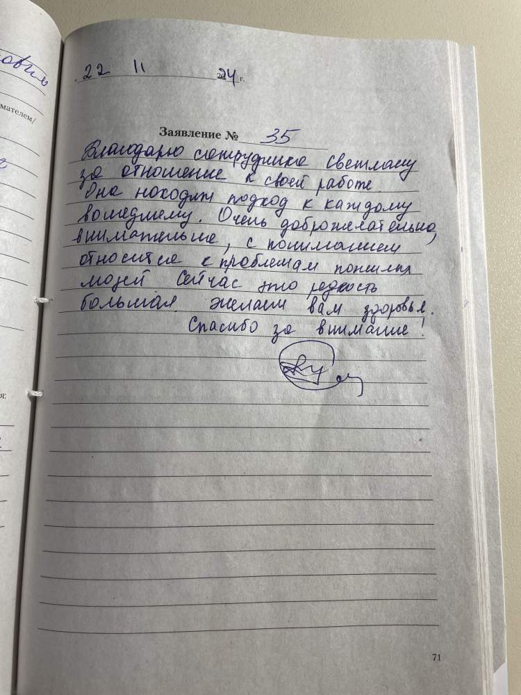 Благодарю сотрудника Светлану, за отношение к своей работе. Она находит подход к каждому вошедшему. Очень доброжелательна, внимательна, с пониманием относится к проблемам пожилых людей. Сейчас это редкость большая. Желаем вам здоровья.