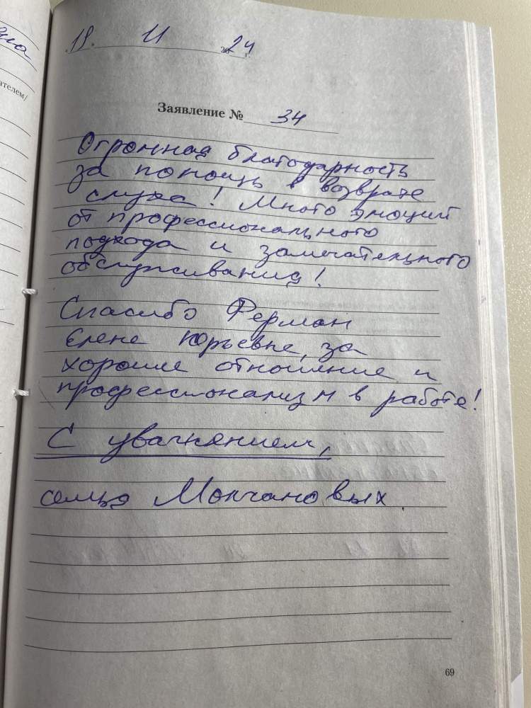 Огромная благодарность за помощь в возврате слуха! Много эмоций от профессионального подхода и замечательного обслуживания! Спасибо Ферман Елене Юрьевне за хорошее отношение и профессионализм в работе!