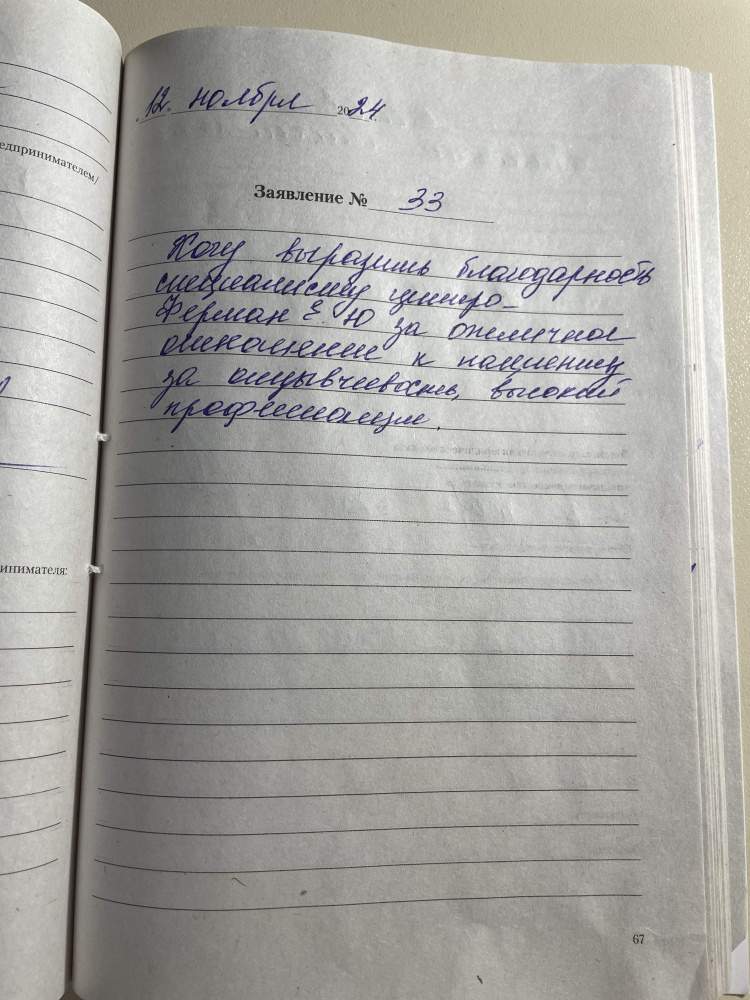 Хочу выразить благодарность специалисту центра Ферман Е.Ю. за отличное отношение  к пациенту, за отзывчивость, высокий профессионализм.