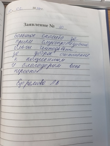 Большое спасибо за прием слухопротезиста Ольги Геннадьевны, за доброе отношение к пациентам и благодарим весь персонал