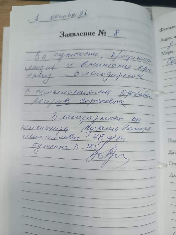 За чуткость, профессионализм и внимание приношу - благодарность с пожеланиями здоровья Марии Сергеевне, благодарность от пенсионера Лукина Валерия Михайловича 78 лет.