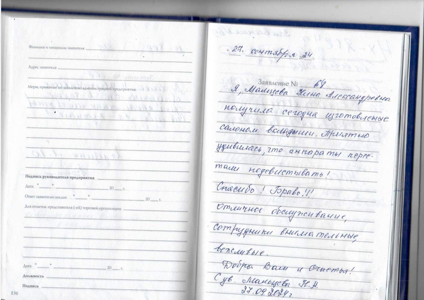 Я,Мальцева Нина Александровна получила сегодня изготовленными салоном вкладыши .Приятно удивилась,что аппараты перестали подсвистывать! Спасибо! Браво! отличное обслуживание ,сотрудники внимательные ,вежливые .Добро Вам И Счастья ! С ув.Мальцева Н.А