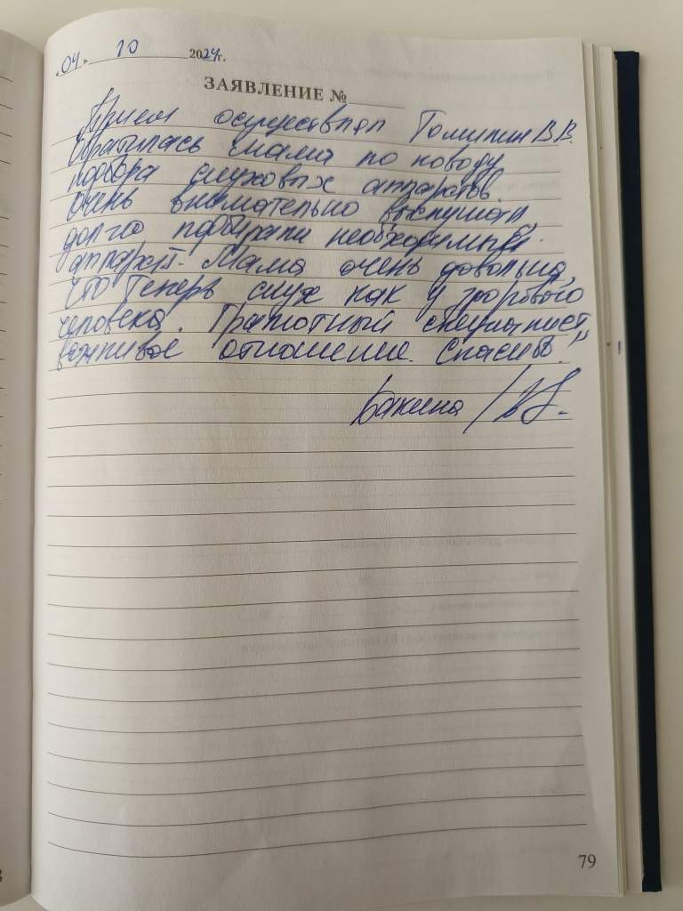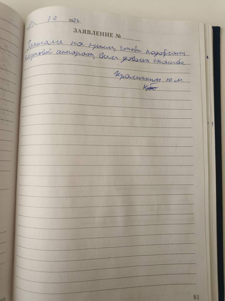 Отзыв: 15.10.24г. я была на приёме у ст. глав. спец-та АкадСлуха. Она проверила мне слух на оба уха. Оказалось, что у меня потеря слуха на обоих глазах IV степени , аппараты у меня (2) есть, надо идти провести настройку (на КМ. №30)