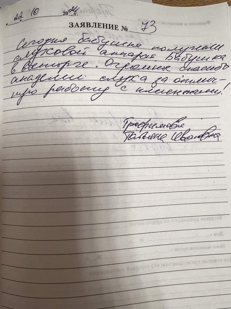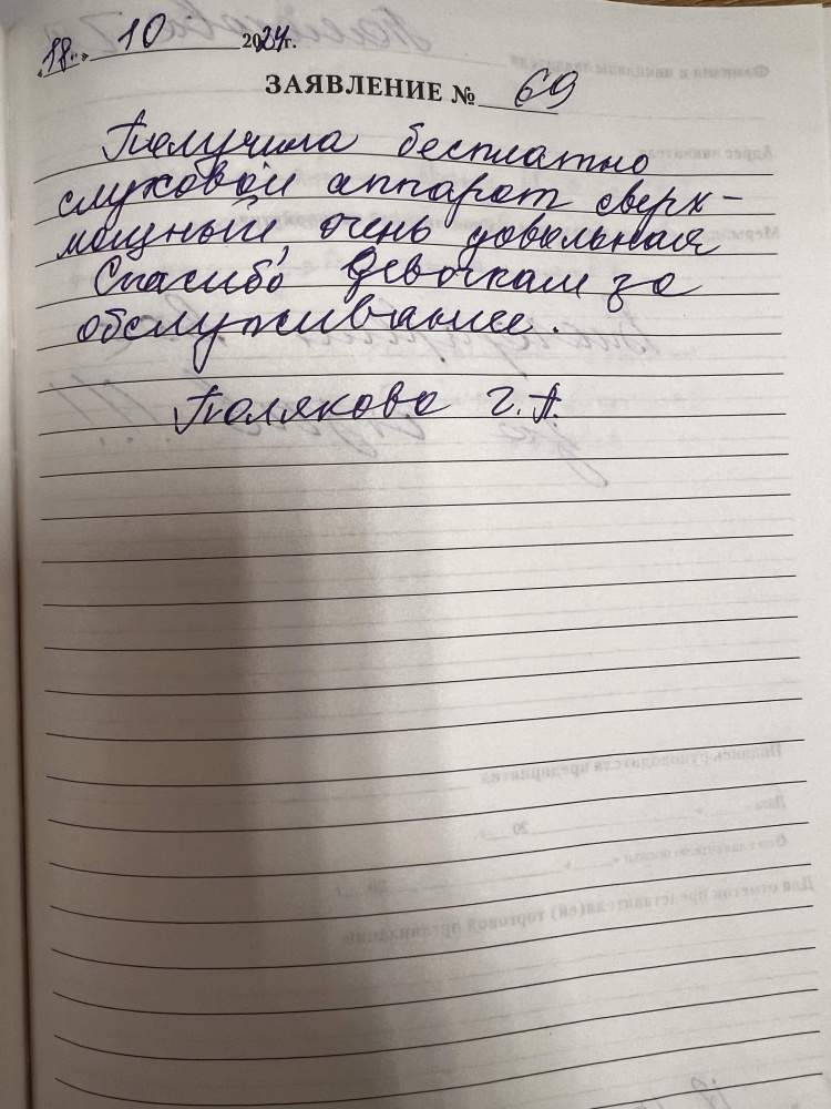 Сегодня бабушка получила слуховой аппарат . Бабушка в восторге . Огромное спасибо Академии слуха за отличную работу с клиентами !