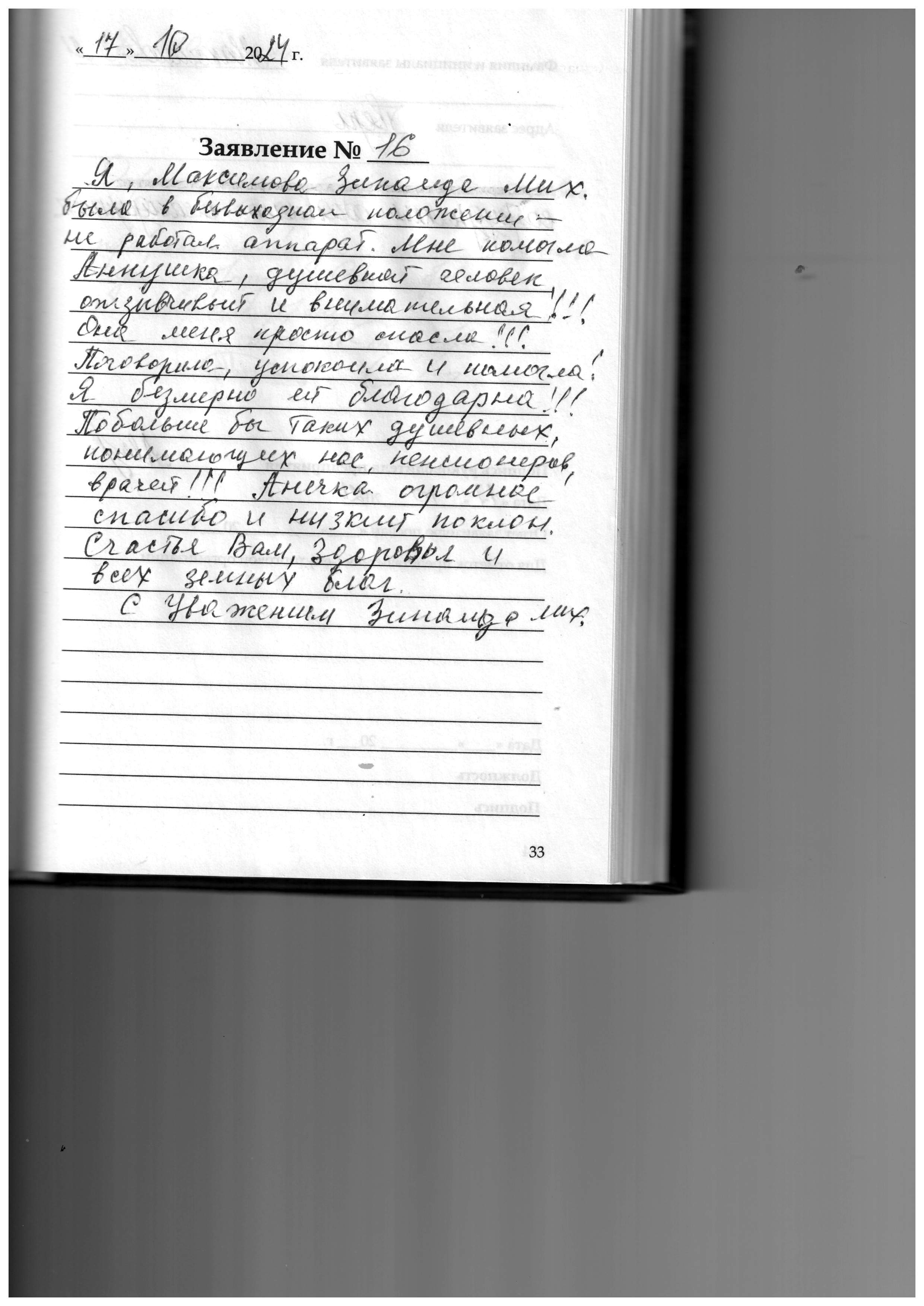 Я, Максимова Зинаида Михайловна была в безвыходном положении - не работал аппарат. Мне помогла Аннушка, душевный человек, отзывчивый и внимательный!!!Она меня просто спасла!!! Поговорила, успокоила и помогла! Я безмерно ей благодарна!!! Побольше бы таких душевных, понимающих нас пенсионеров, врачей. Анечка огромное спасибо и низкий поклон. Счастья Вам, здоровья и всех земных благ. С уважением Зинаида Михайловна.