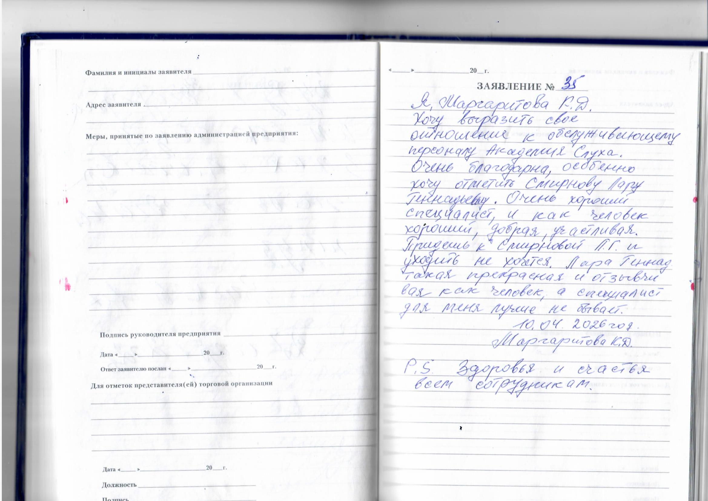 Хочу выразить благодарность всему коллективу "Академии слуха" . Очень доброжелательные,вежливые сотрудники.Особая признательность Леночке.
