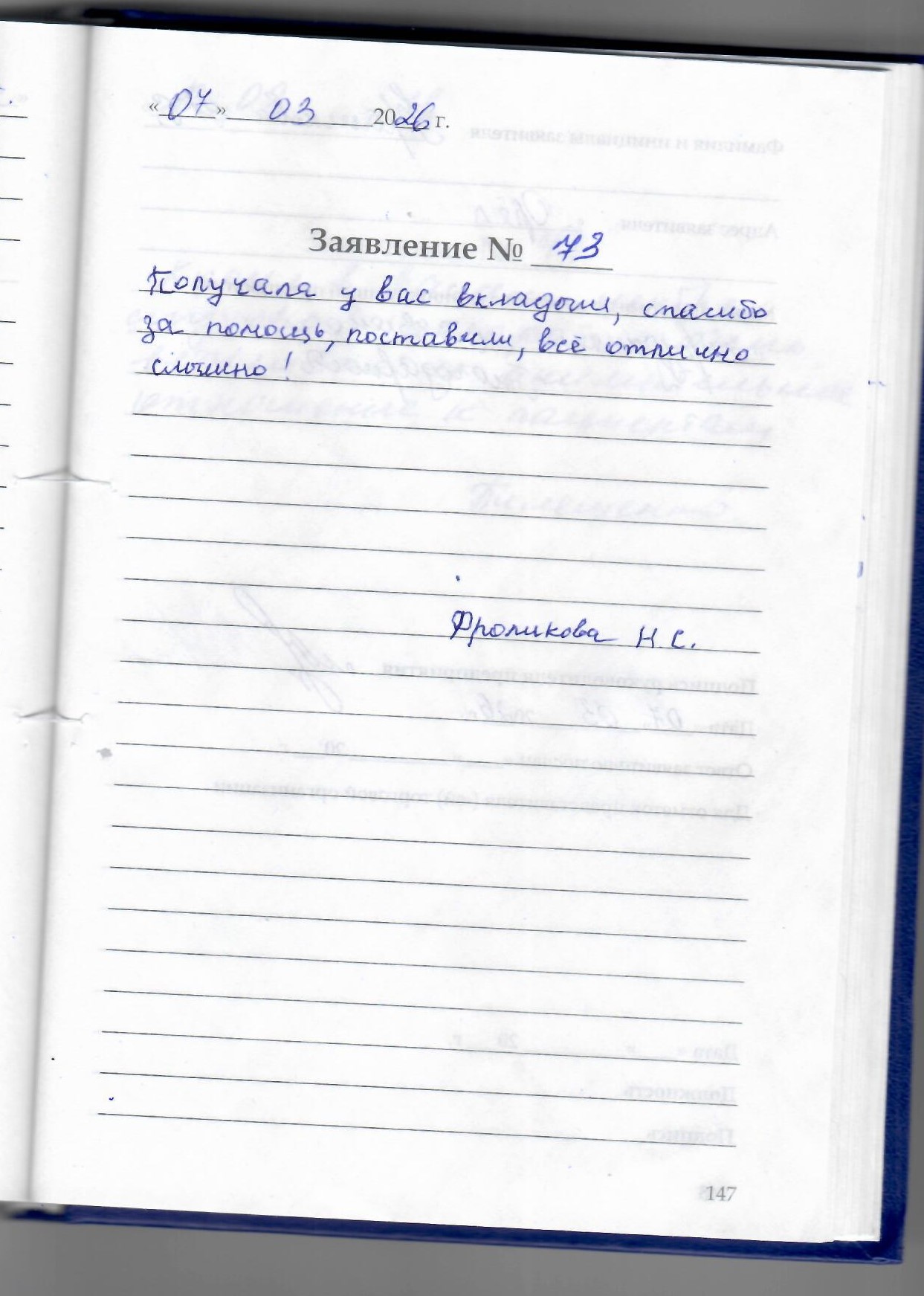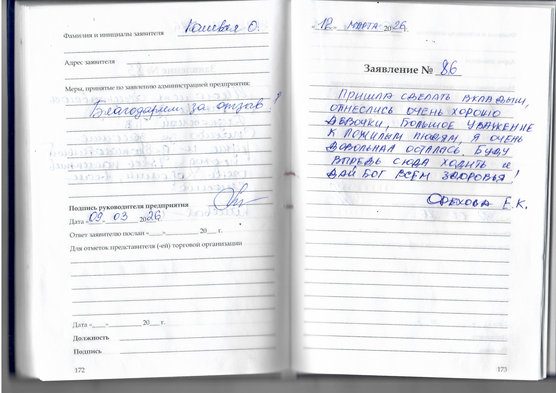 Пришла сделать вкладыш, отнеслись очень хорошо девочки, большое уважение к пожилым людям, я очень довольна осталась. Буду впредь сюда ходить и дай Бог всем здоровья! Орехова Е.К.