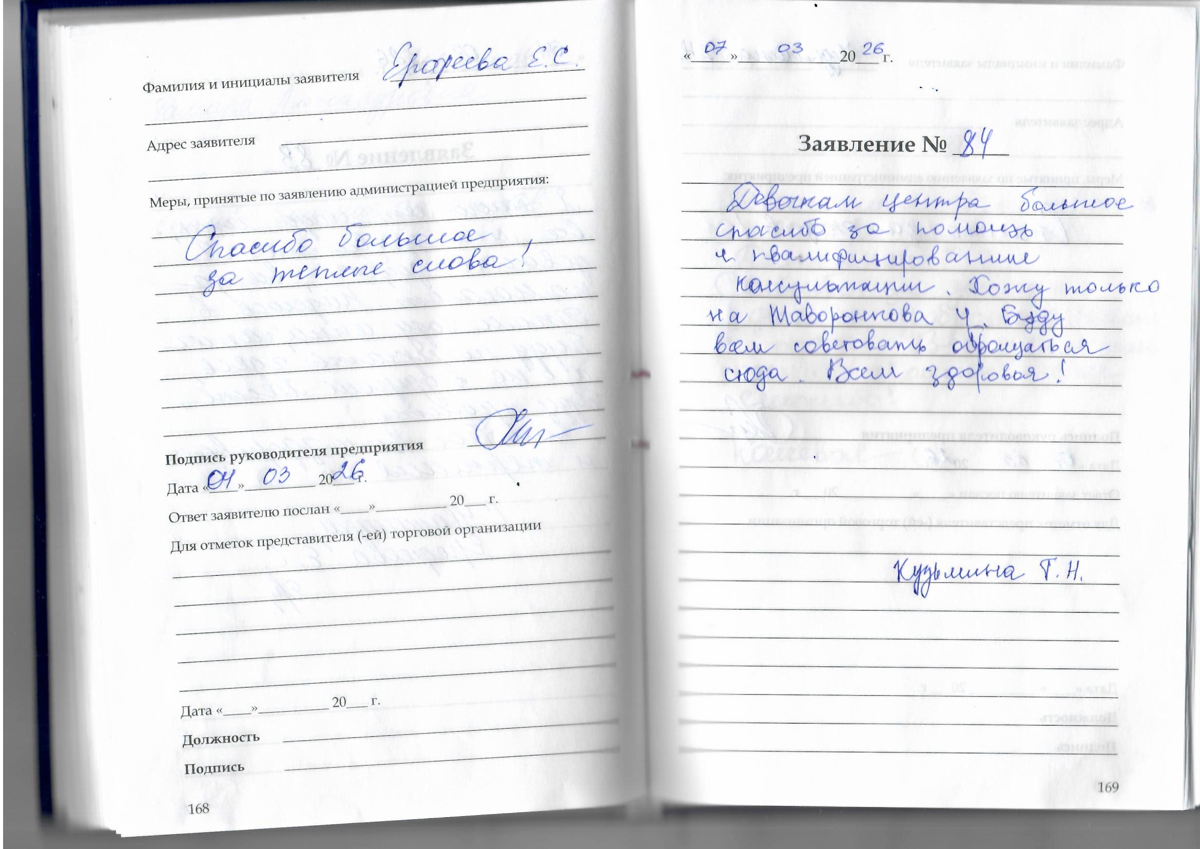 Девочкам центра большое спасибо за помощь и квалифицированные консультации. Хожу только на Жаворонкова 4. Буду всем советовать обращаться сюда. Всем здоровья! Кузьмина Т.Н.