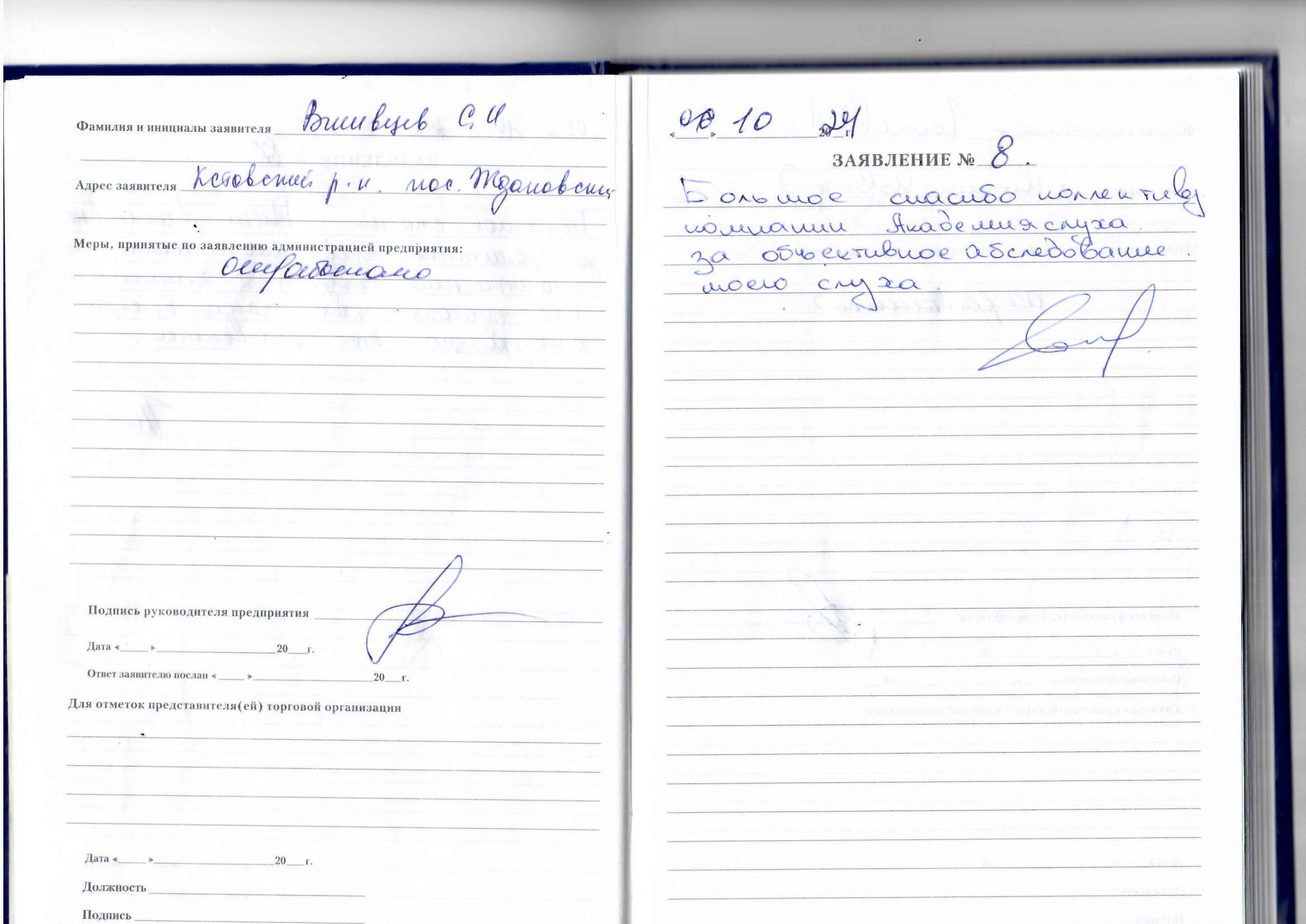 Я, Калуцких Ал-др Павл., благодарен коллективу сотрудникам «Академии слуха», за настройку аппаратов и бережное отношение к пациенту, я очень доволен.