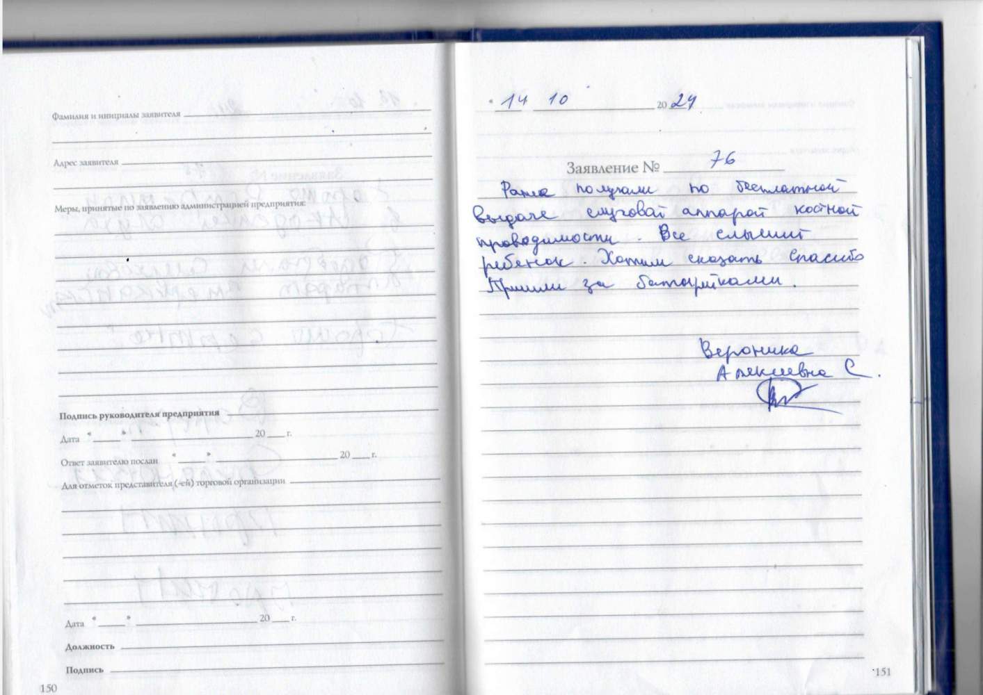 Ранее получали по бесплатной выдаче слуховой аппарат костной проводимости.Все слышит ребенок.Хотим сказать спасибо.Пришли за батарейками.