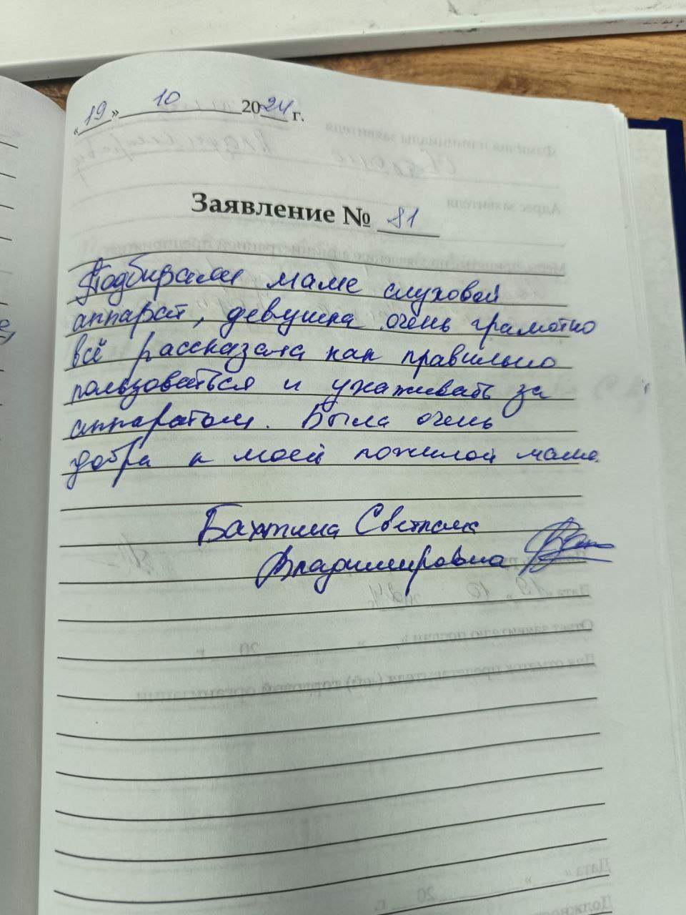 Сегодня с мамой посетили ваш центр. Очень понравилось внимательное и доброжелательное отношение. Сотрудники качественно и профессионально помогли с подбором слухового аппарата, сделали бесплатное обследование слуха. Спасибо большое. Все очень понравилось!
