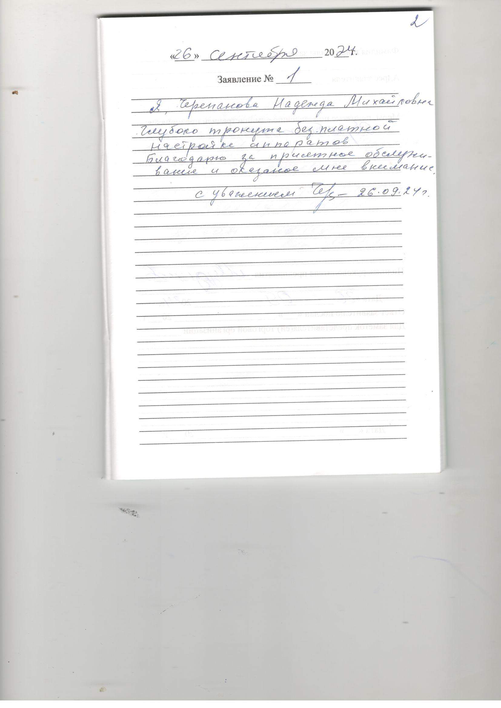 Я,Черепанова Надежда Михайловна глубоко тронута бесплатной настройкой аппаратов.Благодарю за приятное обслуживание и оказанное мне внимание.