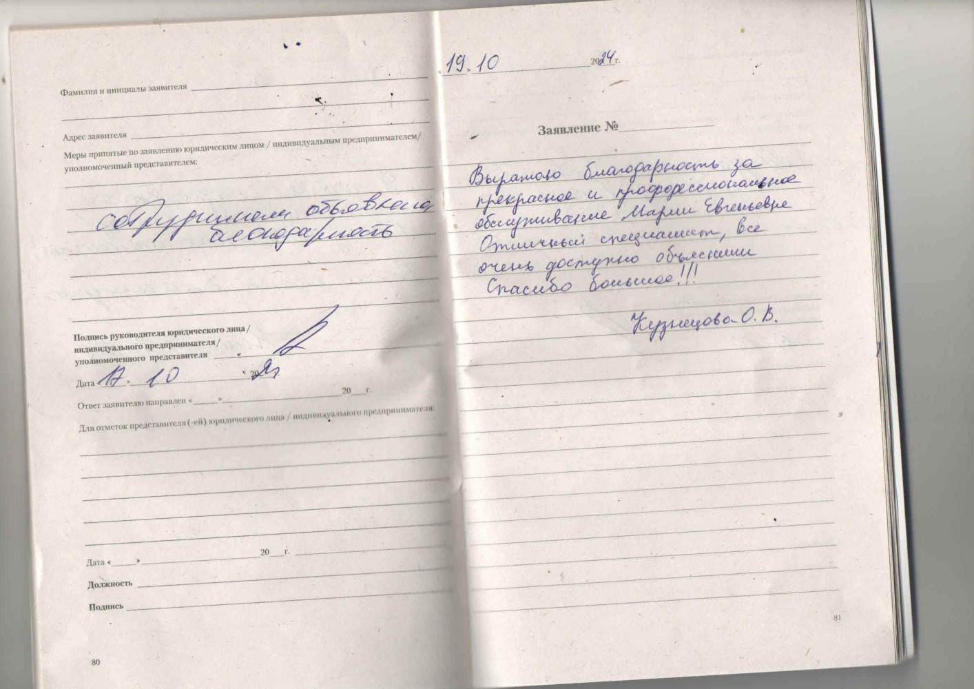 Выражаю благодарность за прекрасное и профессиональное обслуживание Марии Евгеньевне. Отличный специалист, все очень доступно объяснили. Спасибо большое!!!