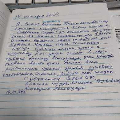Я, Сивков Валентин Николаевич, выношу огромную благодарность всему коллективу "Академии Слуха" за отличное обслуживание, за высокий профессионализм в работе. Особенно отмечаю таких сотрудников Наталья Юрьевна, Ольга Геннадьевна. Всегда благожелательны, чутки к пациенту.Это дорого стоит. Я, переживший блокаду Ленинграда, эти качества особенно высоко ценю. Желаю всем работникам крепкого здоровья, душевного спокойствия, счастья, долгих лет жизни. С уважением,Сивков В.Н., ветеран труда, ветеран В.О. войны, блокадник Ленинграда.