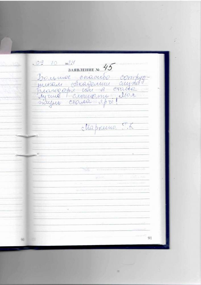 Прошу вынести благодарность сотрудникам Академии слуха за чуткое отношение к пациентам. Спасибо за заботу и тактичное обслуживание.