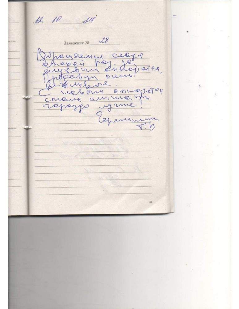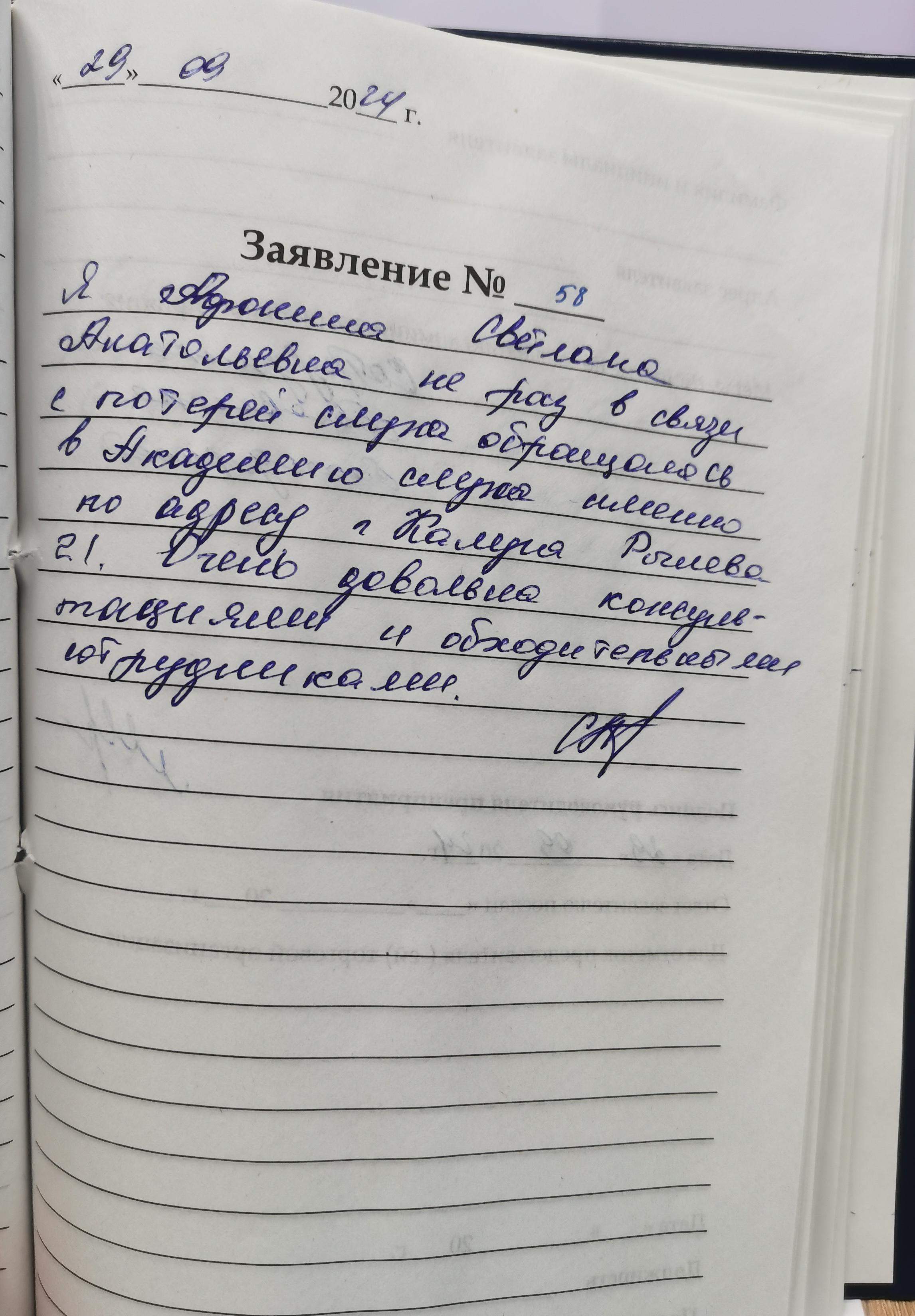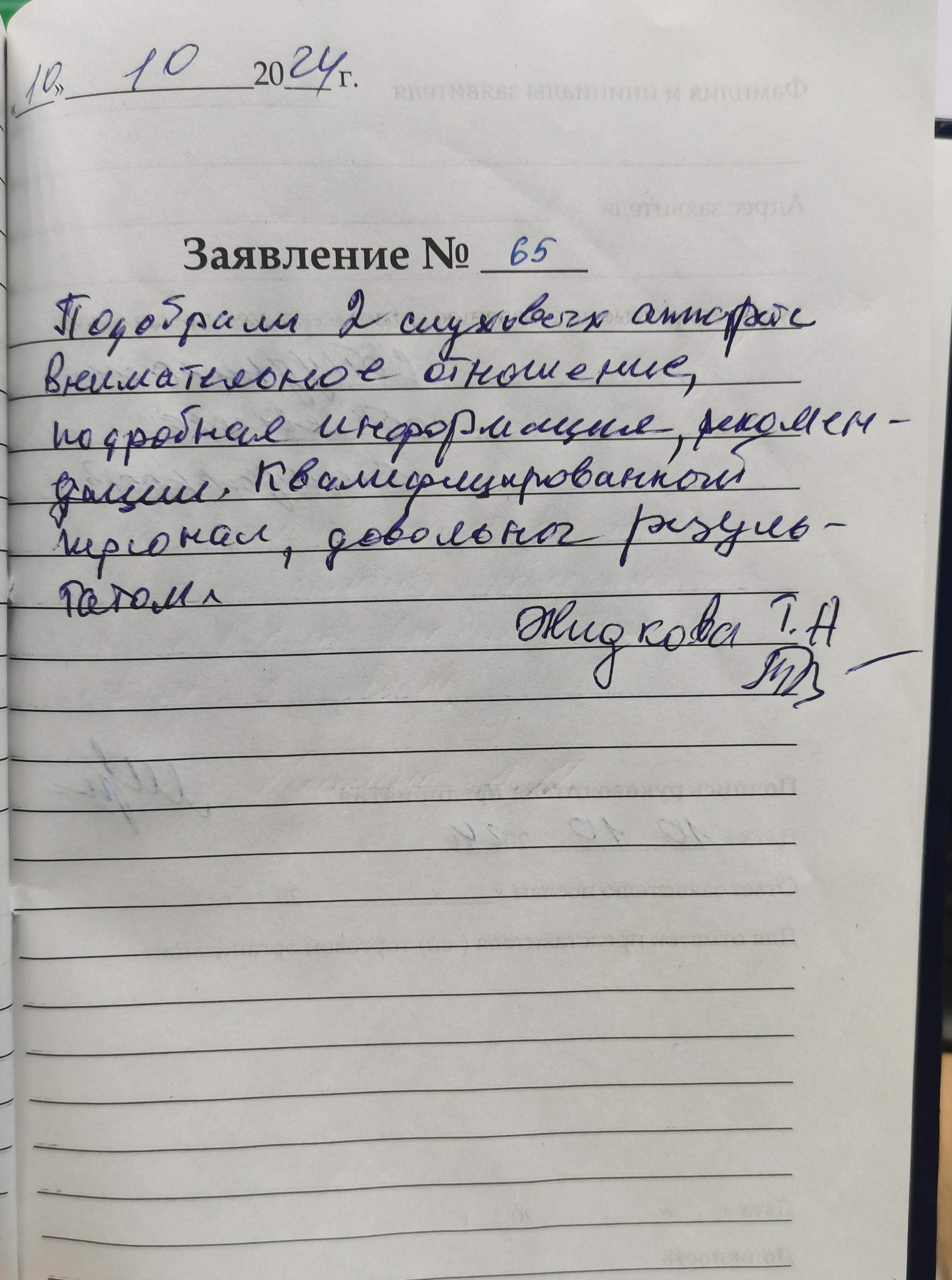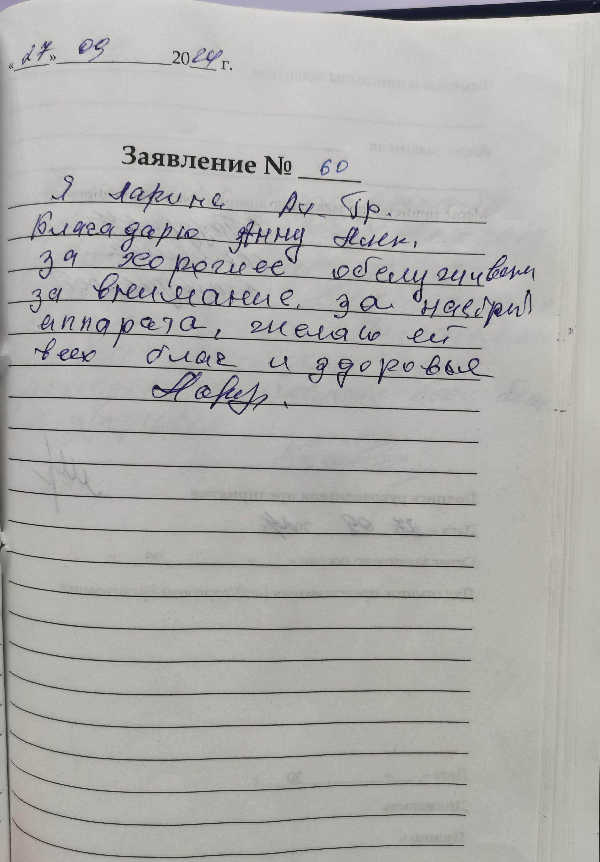 Я Ларина Ал. Гр. благодарю Анну Александровну за хорошее обслуживание, за внимание, за настройку аппарата. Желаю ей всех благ и здоровья.