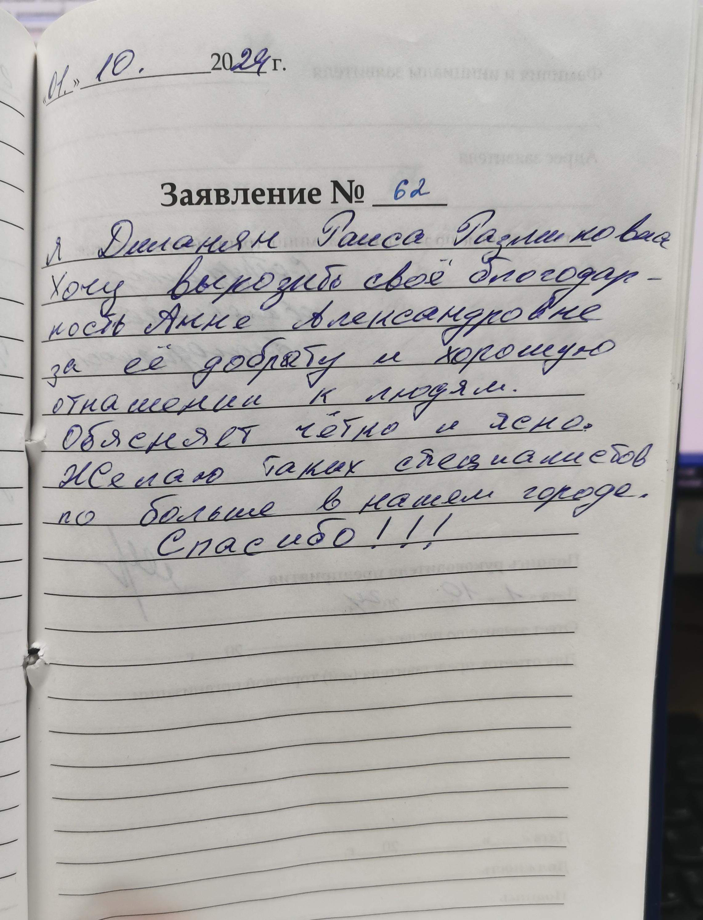 Я, Диланян Раиса Размиковна, хочу выразить свою благодарность Анне Александровне за ее доброту и хорошее отношение к людям. Объясняет четко и ясно. Желаю таких специалистов побольше в нашем городе. Спасибо!!!