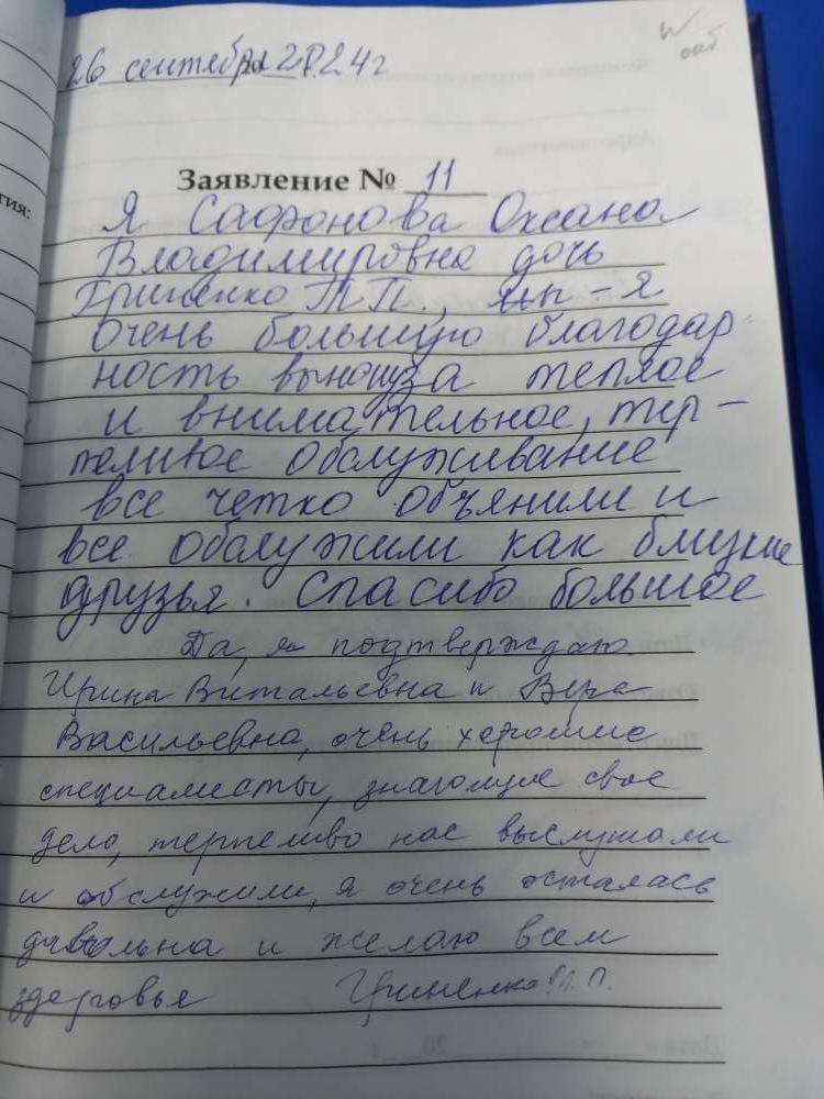 Я Сафонова Оксана Владимировна, дочь Гриненко Т.П. Очень большую благодарность выношу за теплое и внимательное , терпеливое обслуживание, все четко объяснили и обслужили как близкие друзья. Спасибо большое.