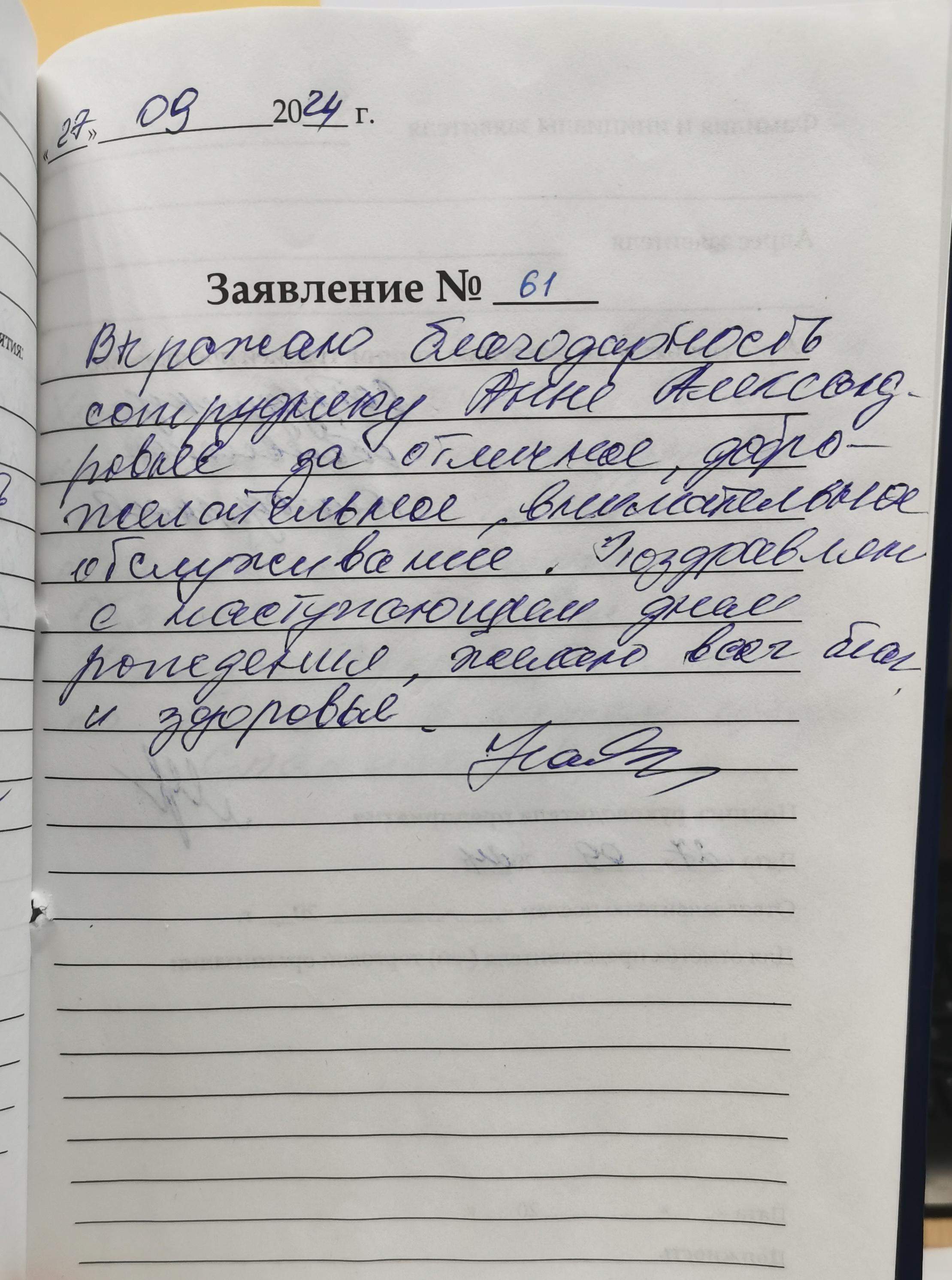 Выражаю благодарность Анне Александровне за отличное, доброжелательное обслуживание. Поздравляю с наступающим днем рождения. Желаю всех благ и здоровья.