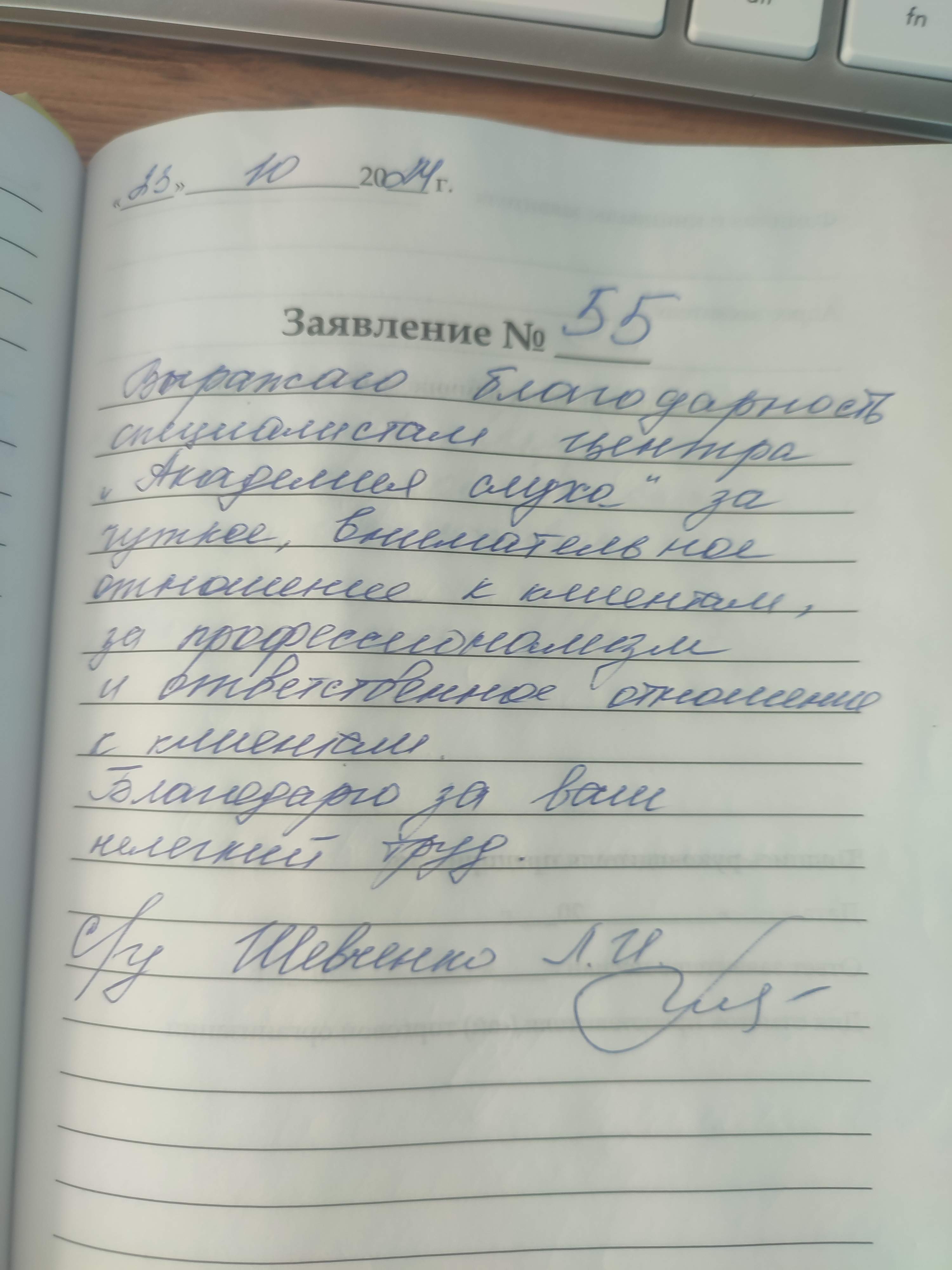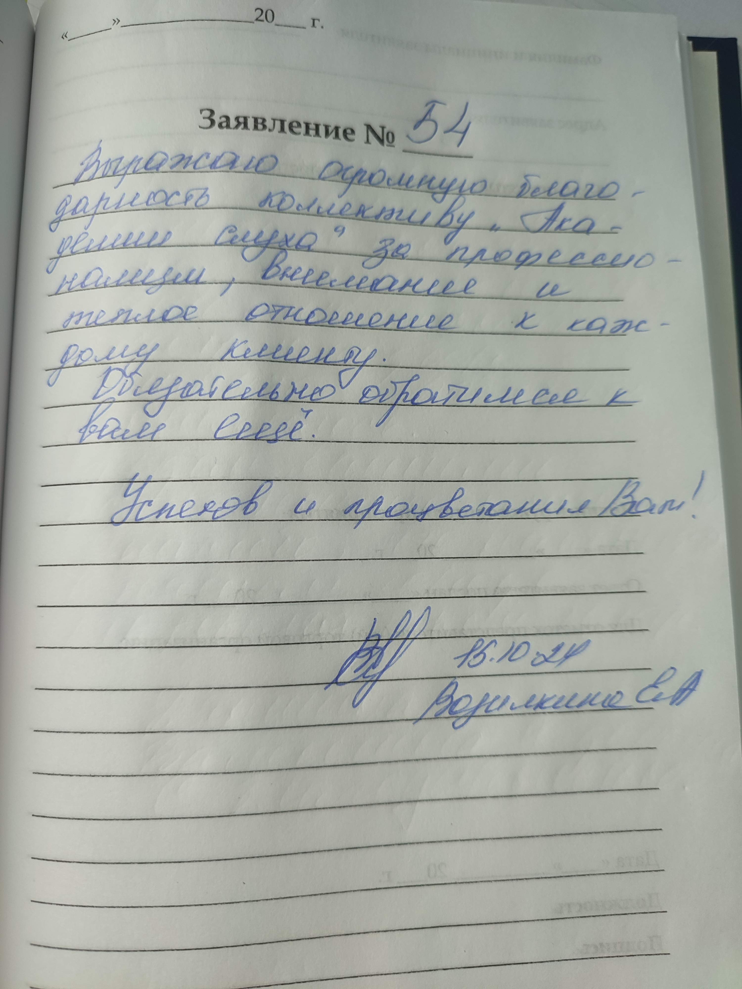 Выражаю благодарность специалистам центра " Академия Слуха" за чуткое, внимательное отношение к клиентам, за профессионализм и ответственное отношение к клиентам.