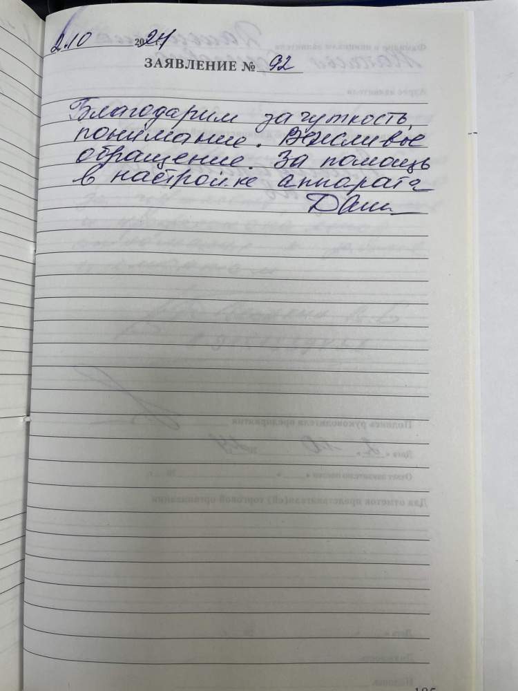 Благодарим за чуткость, понимание. Вежливое обращение. За помощь в настройке аппарата.