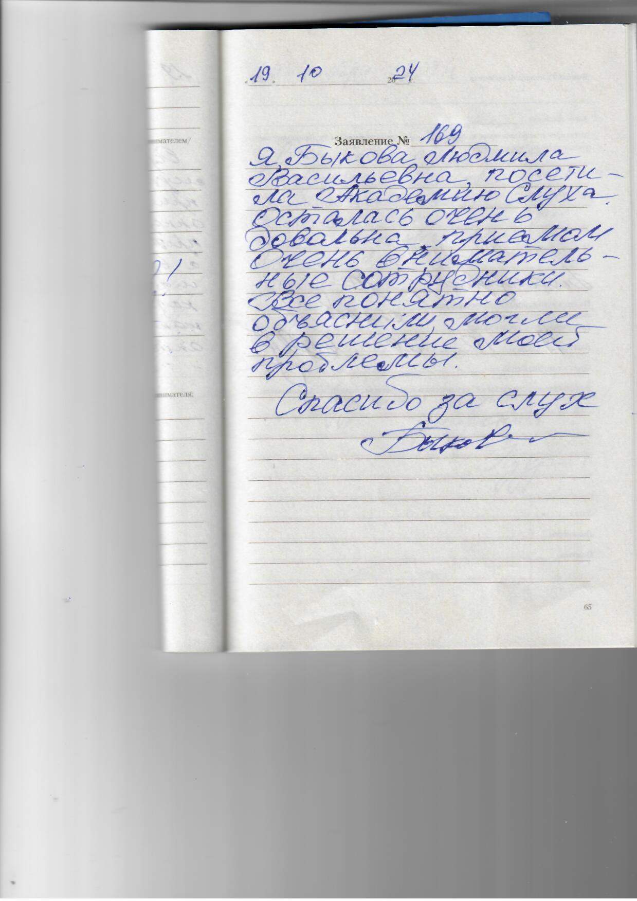 Я, Быкова Людмила Васильевна, посетила Академию Слуха. Осталась очень довольна приемом. Очень внимательные сотрудники. Все понятно объяснили, помогли в решении моей проблемы. Спасибо за слух!