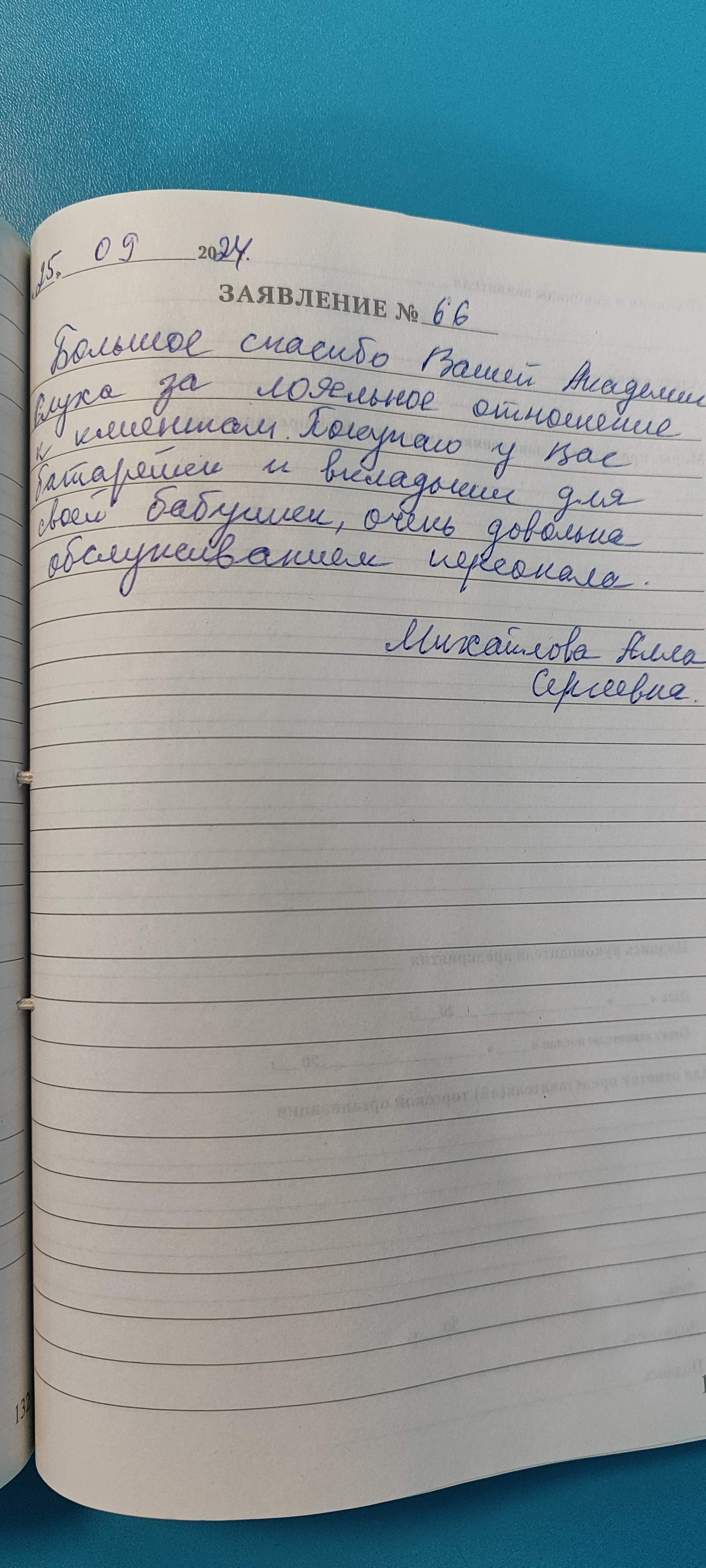 Большое спасибо Вашей Академии Слуха за лояльное отношение к клиентам .Покупаю у Вас батарейки и вкладыши для своей бабушки , очень довольна обслуживанием персонала.