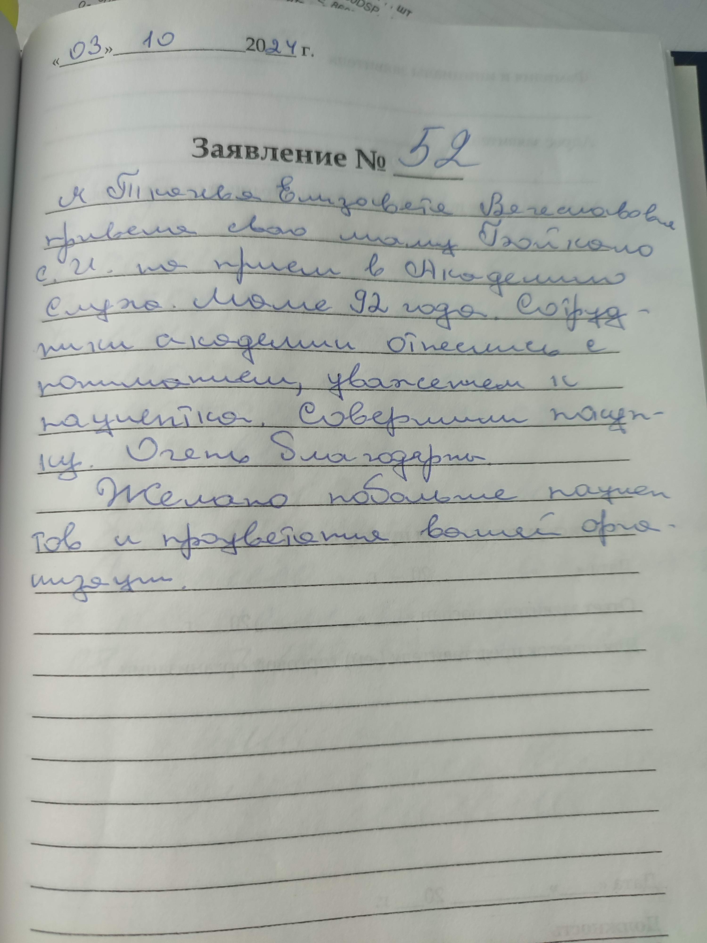 Я Ткачева Елизавета Вячеславовна, привела свою маму, Бойкало С.И. на прием в Академию Слуха. Маме 92 года. Сотрудники Академии отнеслись с пониманием, уважением к пациентке. Совершили покупку. Очень благодарны. Желаю побольше пациентов и процветания вашей организации.