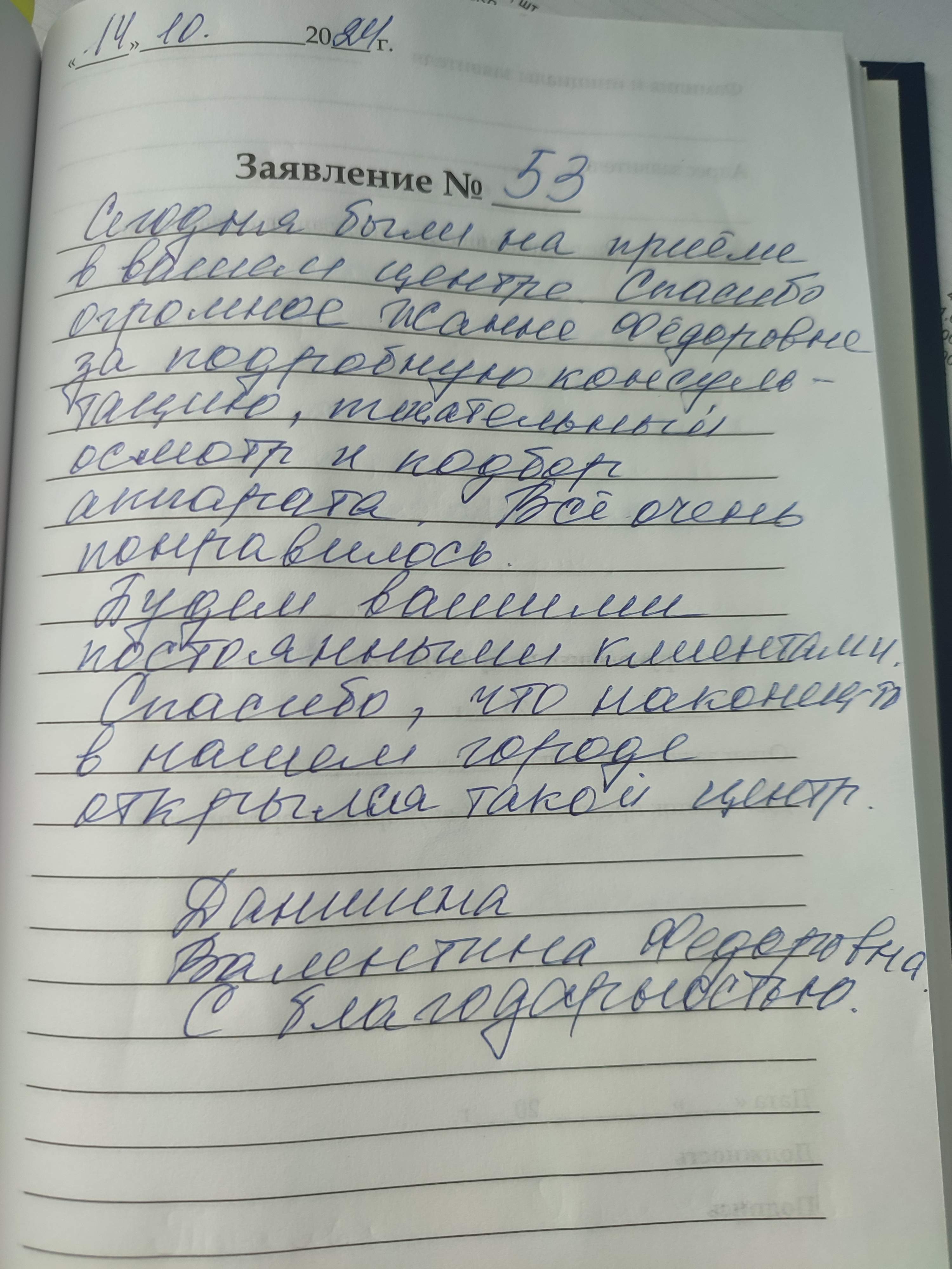 Сегодня были на приеме, в вашем центре.Спасибо огромное Жанне Федоровне, за подробную консультацию, тщательный осмотр и подбор аппарата. Все очень понравилось. Будем вашими постоянными клиентами. Спасибо, что наконец-то в нашем городе открылся такой центр.