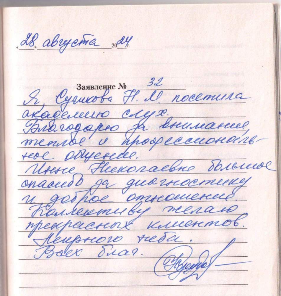 Я, Сучкова Н.М. посетила академию слуха. Благодарю за внимание, теплое и профессиональное общение. Инне Николаевне большое спасибо за диагностику и доброе отношение. Коллективу желаю прекрасных клиентов. Мирного неба. Всех благ.