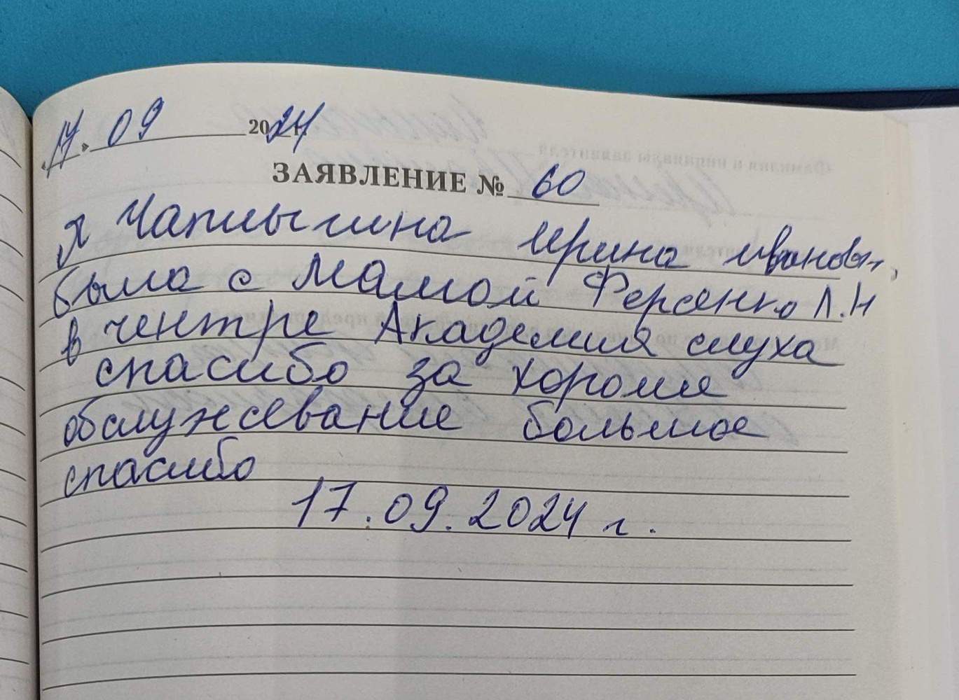 Я Чаплыгина Ирина Ивановна была с мамой Ферсенко Л.Н. в центре Академия слуха спасибо за хорошее обслуживание . Большое спасибо