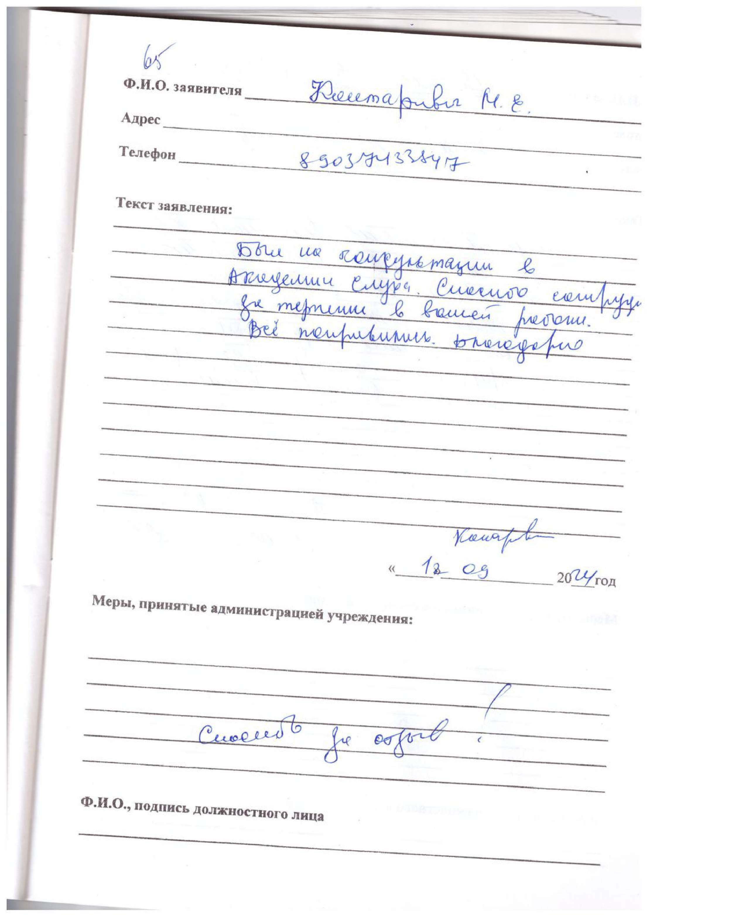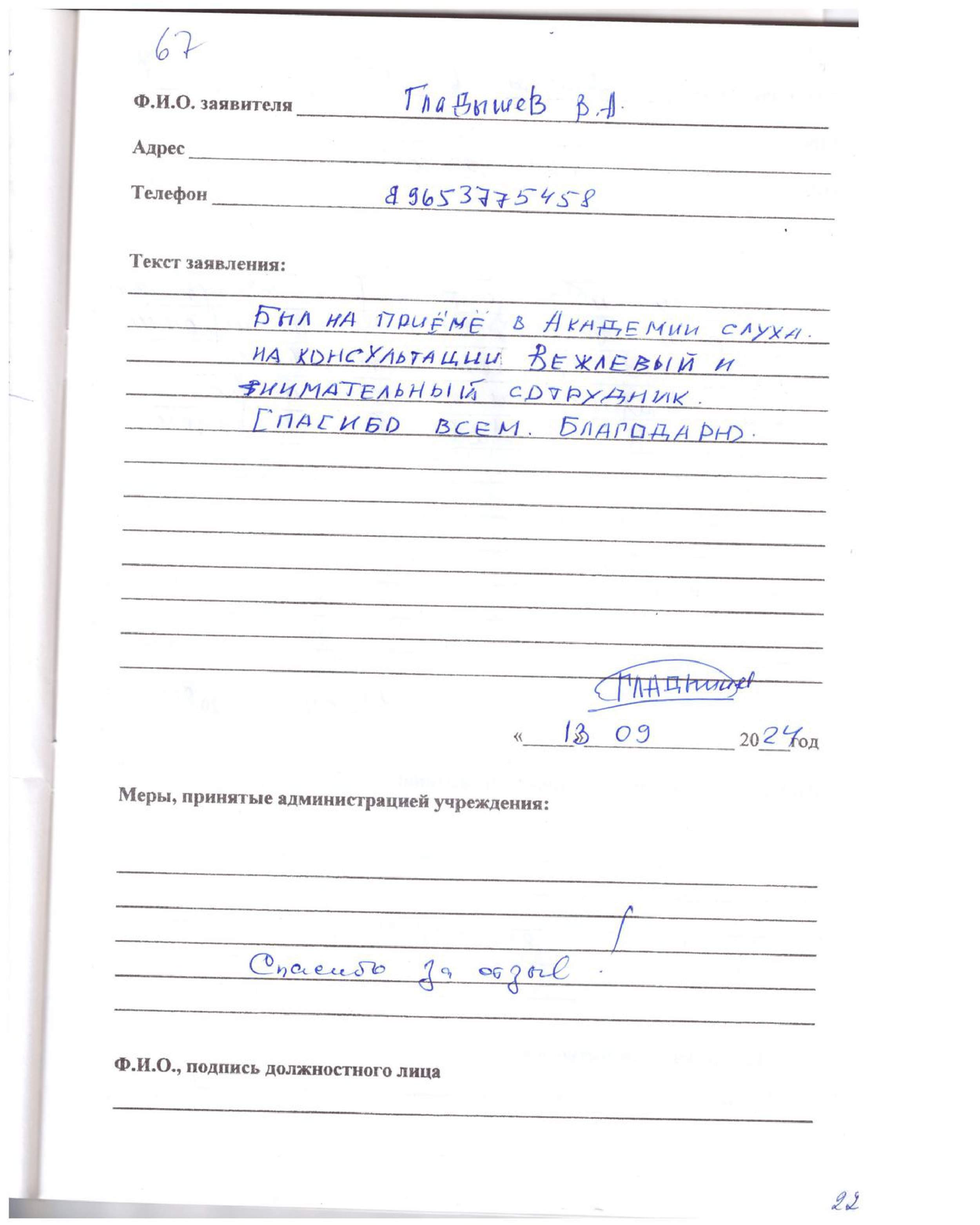 Был на консультации в Академии слуха. Спасибо сотрудникам за терпение в вашей работе. Всё понравилось. Благодарю.
