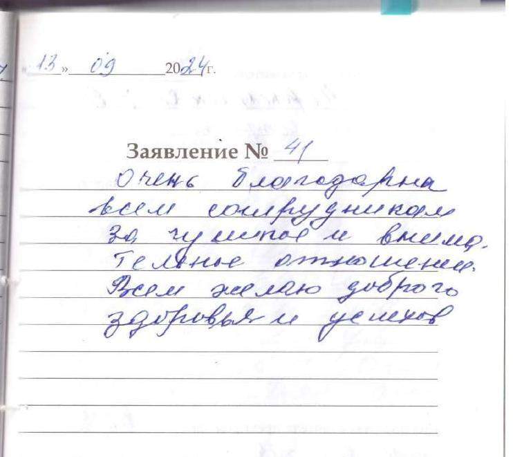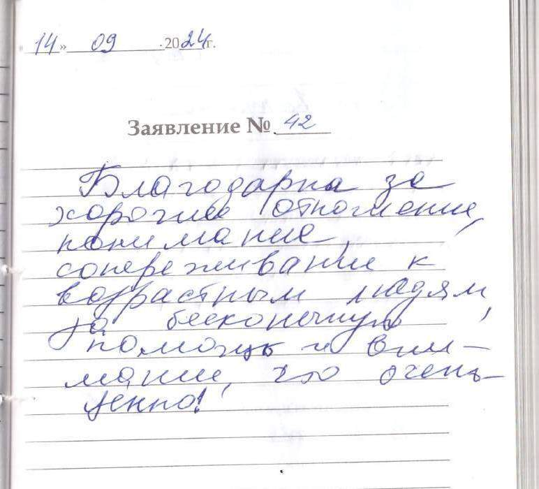 Благодарна за хорошее отношение, понимание, сопереживание к возрастным людям, за бесконечную помощь и внимание