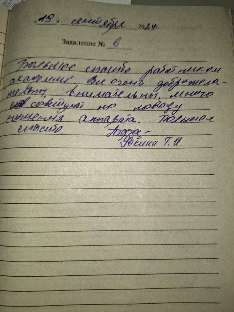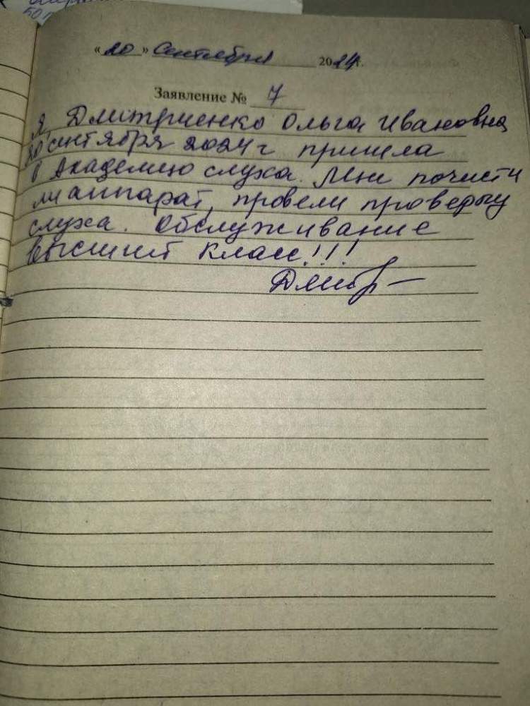 Я, Дмитриенко Ольга Ивановна 20 сентября 2024г. пришла в Академию слуха. Мне почистили аппарат, провели проверку слуха. Обслуживание высший класс!!!