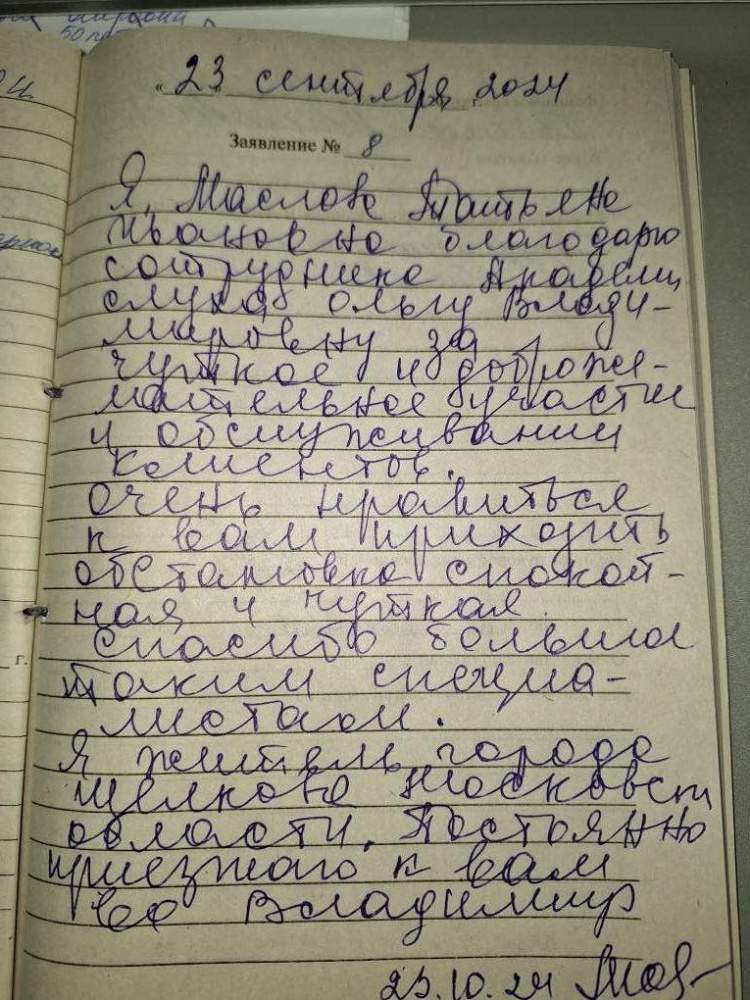 Я Маслова Татьяна Ивановна благодарю сотрудника Ольгу Владимировну за чуткое и доброжелательное участие и обслуживание клиентов. Очень нравится к вам приходить, обстановка спокойная и чуткая. Спасибо большое таким специалистам. Я житель Щелково Московской области. Постоянно приезжаю к вам во Владимир.