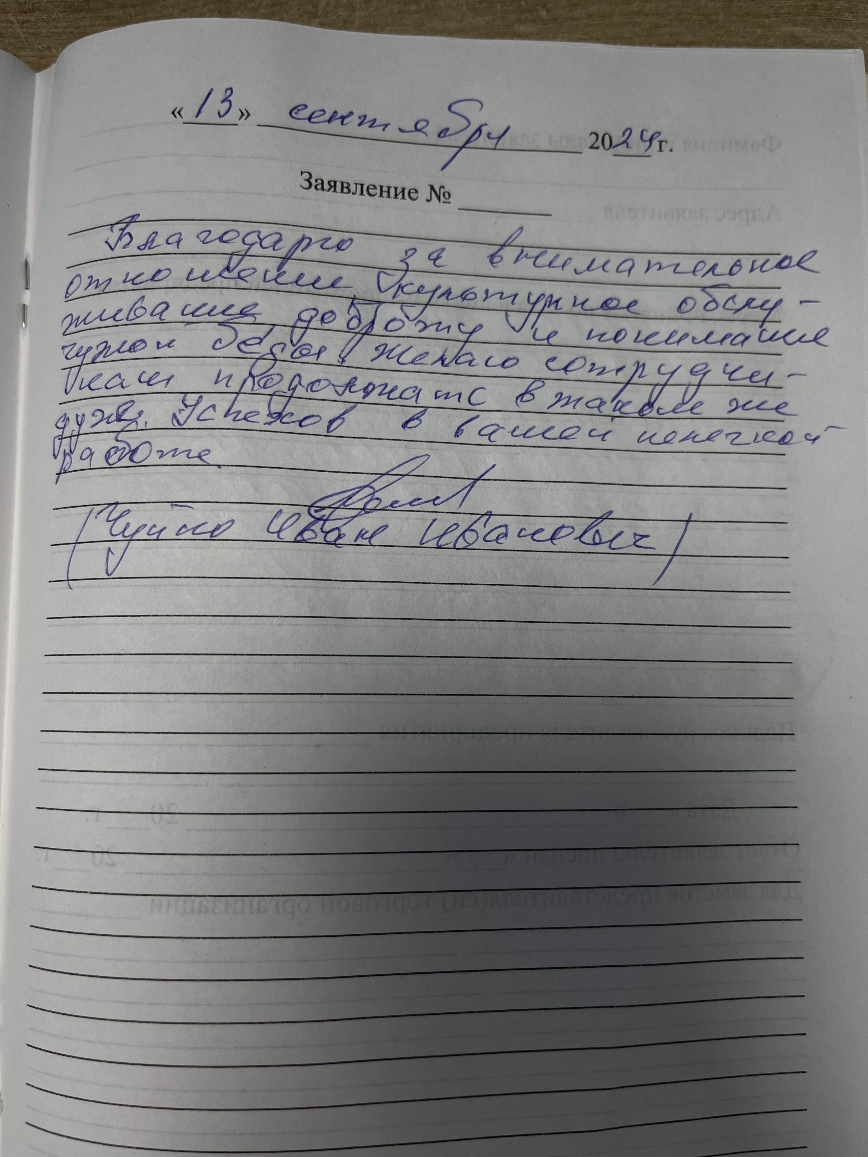 Благодарю за внимательное отношение , культурное обслуживание, доброту и понимание чужой беды. Желаю сотрудникам продолжать в том же духе.Успехов вам в вашей нелегкой работе.