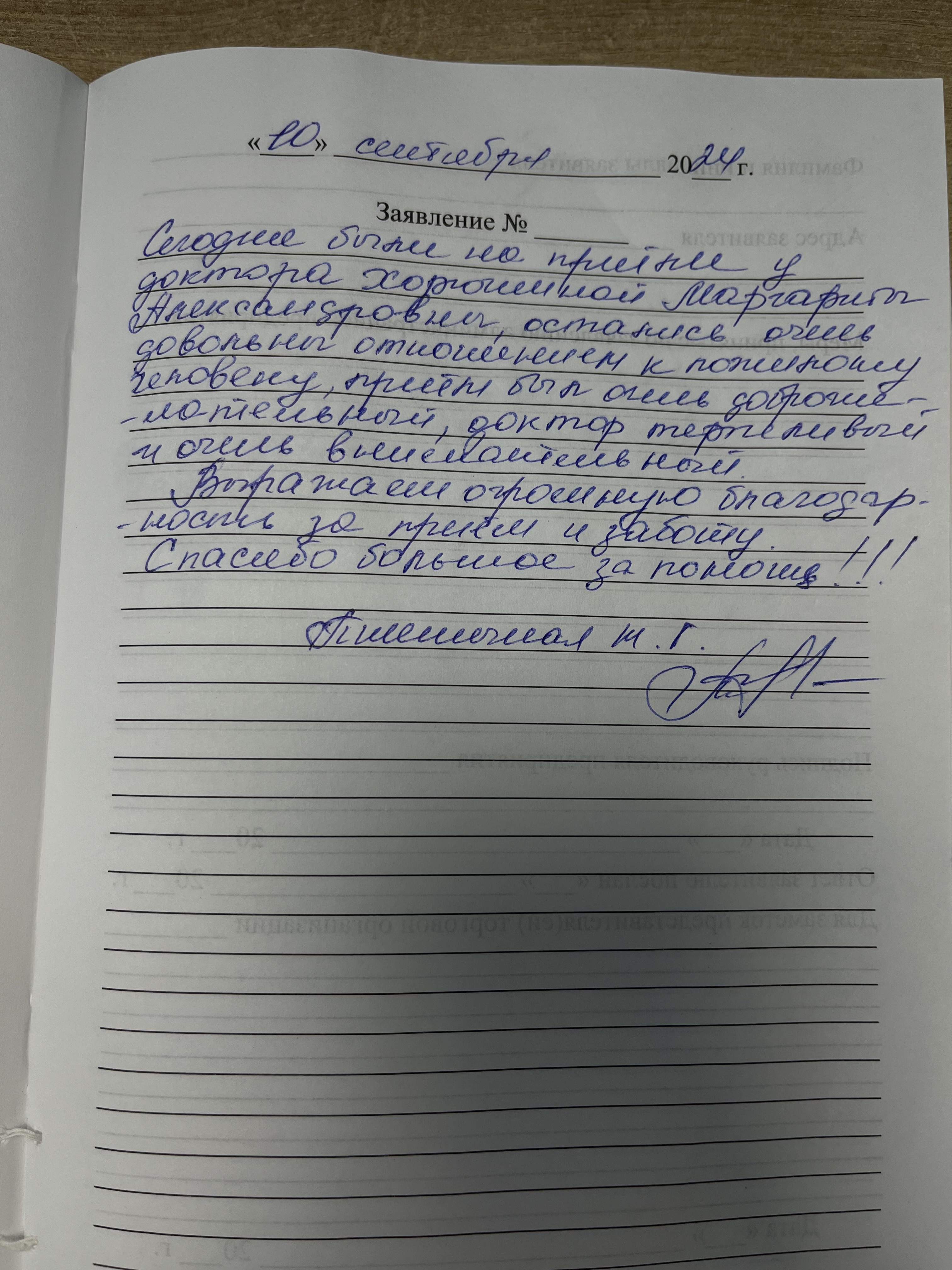 Были на приеме у доктора Хорюшиной Маргариты Александровны, остались очень довольны отношением к пожилому человеку, прием был очень доброжелательный, доктор терпеливый и очень внимательный. Выражаем огромную благодарность за прием и заботу. Спасибо большое за помощь.