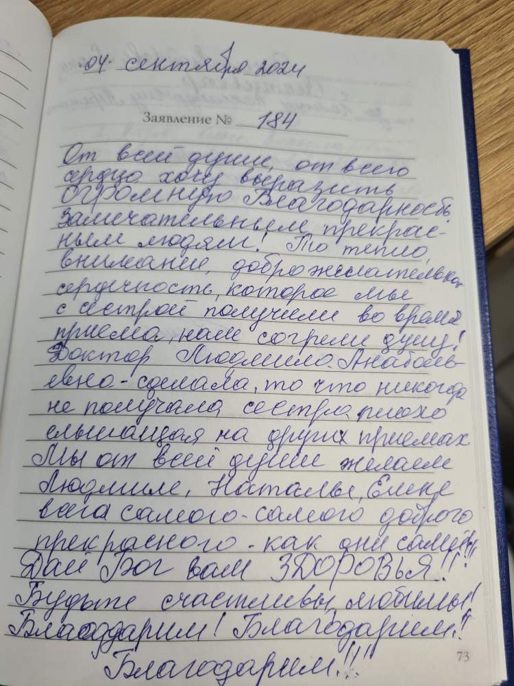 04.09.2024 От всей души, от всего сердца хочу выразить огромную благодарность. Замечательным, прекрасным людям!То тепло, внимание, доброжелательность, сердечность, которую мы с сестрой получили во время приема, нам согрели душу!Доктор Людмила Анатольевна сделала, то что никогда не получала сестра плохо слышащая на других приемах. Мы от всей души желаем Людмиле, Наталье, Елене всего самого самого доброго, прекрасного. Как они сами!!! Дай Бог вам здоровья!!Будьте счастливы, любимы! Благодарим!Благодарим!!Благодарим!!!