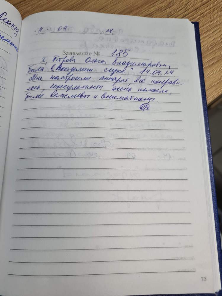 14.09.2024 Я, Петрова Ольга Владимировна, была в "Академии Слуха" 14.09.2024 Мне настроили аппарат, все понравилось, консультанты очень помогли, были вежливы и внимательны